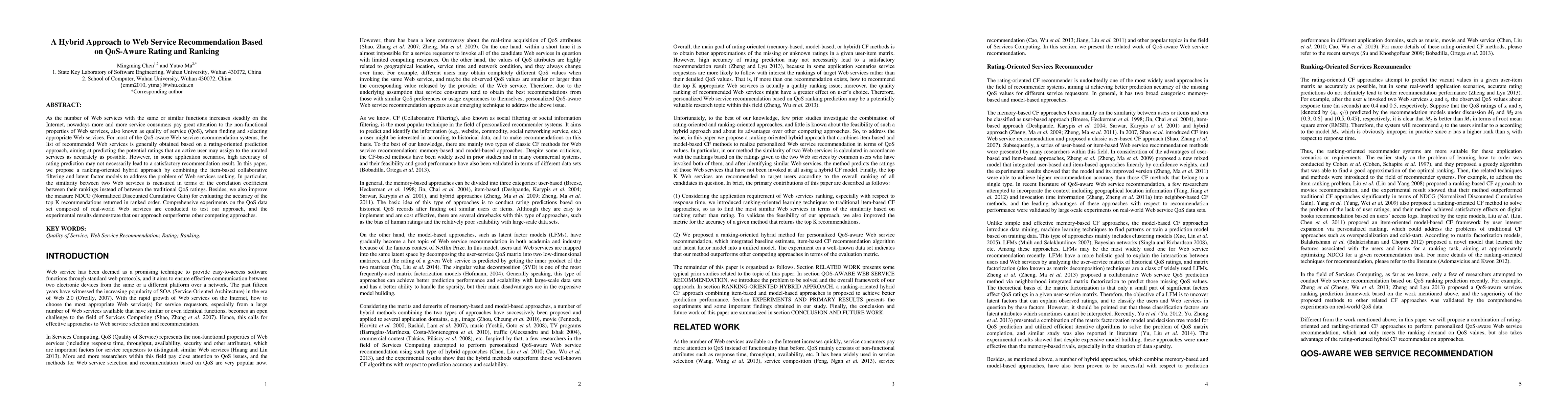 This paper proposes a hybrid recommendation approach combining collaborative filtering and latent factor models for QoS-aware Web service ranking, focusing on ranking accuracy rather than rating prediction. The method measures service similarity based on ranking correlation and improves the NDCG metric for evaluation, showing superior performance in experiments.