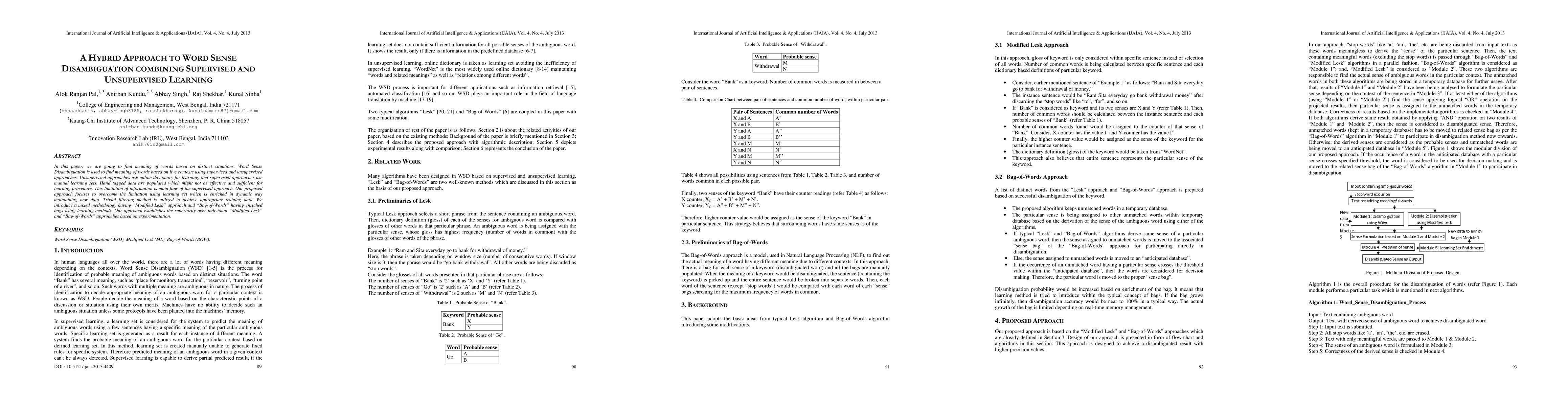 This research introduces a hybrid approach for Word Sense Disambiguation, combining supervised and unsupervised learning to overcome limitations of existing methods. The proposed method, integrating Modified Lesk and Bag-of-Words with enriched learning, outperforms individual approaches based on experimental validation.