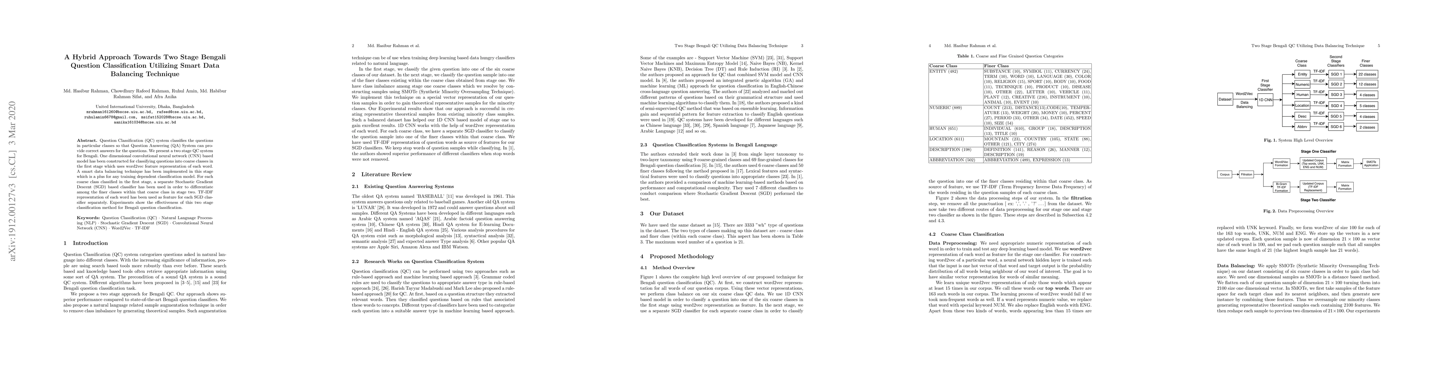 This paper proposes a two-stage Bengali question classification system using a hybrid approach that combines 1D CNN and SGD classifiers. It employs a smart data balancing technique to enhance the model's learning efficiency and achieves effective classification of factoid type questions.