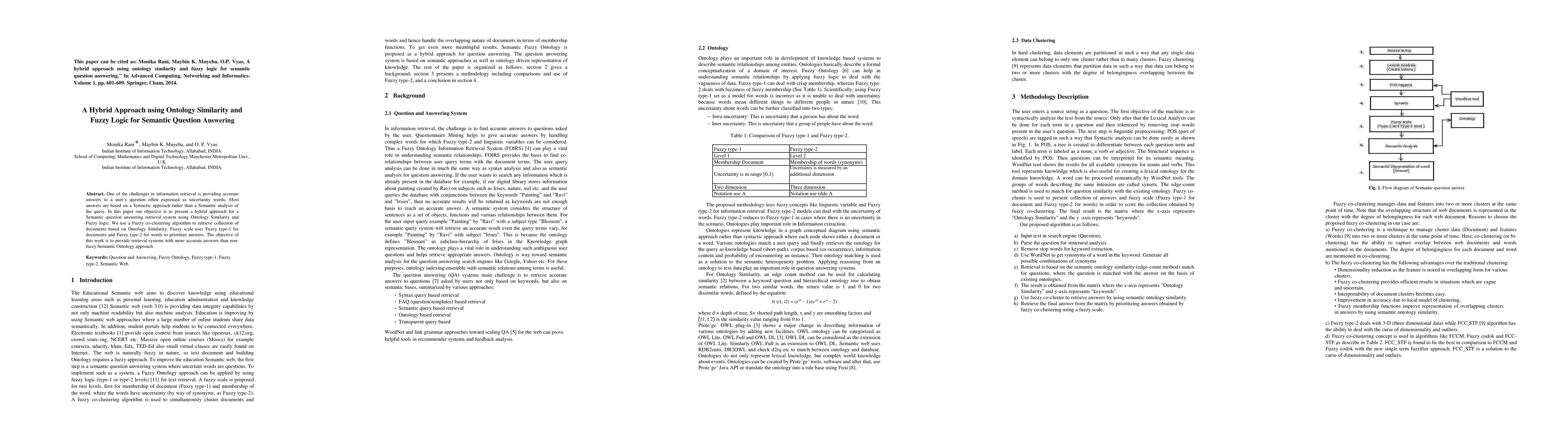 One of the challenges in information retrieval is providing accurate answers to a user's question often expressed as uncertainty words. Most answers are based on a Syntactic approach rather than a Semantic analysis of the query. In this paper, our objective is to present a hybrid approach for a Semantic question answering retrieval system using Ontology Similarity and Fuzzy logic. We use a Fuzzy Co-clustering algorithm to retrieve the collection of documents based on Ontology Similarity. The Fuzzy Scale uses Fuzzy type-1 for documents and Fuzzy type-2 for words to prioritize answers. The objective of this work is to provide retrieval system with more accurate answers than non-fuzzy Semantic Ontology approach.