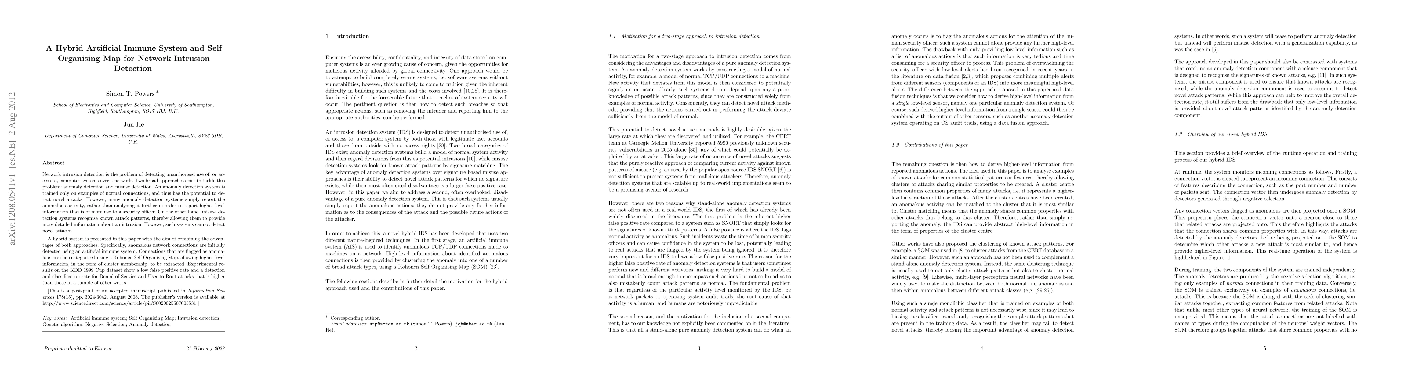 This paper proposes a hybrid system combining an artificial immune system for detecting anomalous network connections and a Self Organising Map for categorising flagged anomalies, achieving lower false positive rates and higher detection rates for specific attacks compared to other methods.