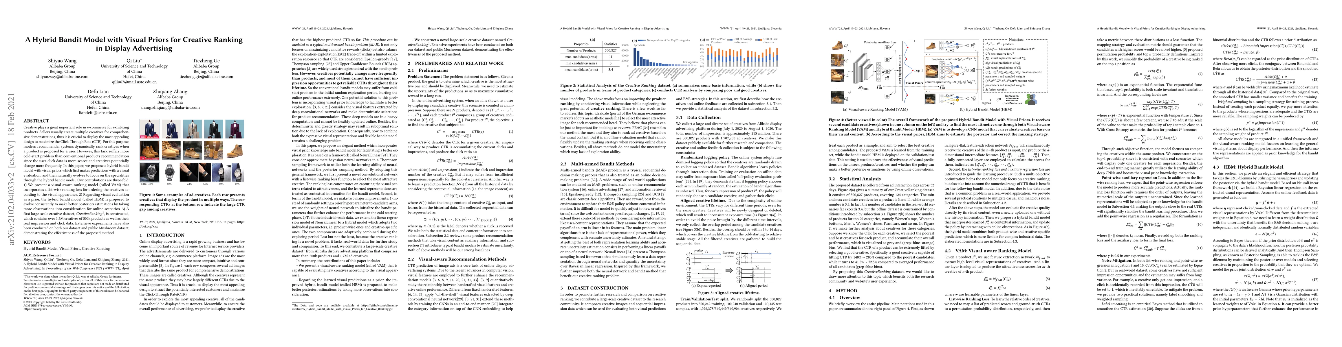 This paper proposes a hybrid bandit model with visual priors to rank creatives in display advertising, aiming to maximize Click-Through Rate (CTR). The model integrates a visual-aware ranking model (VAM) and a hybrid bandit model (HBM) to address the cold-start problem, and a large-scale dataset, CreativeRanking, was constructed for evaluation.