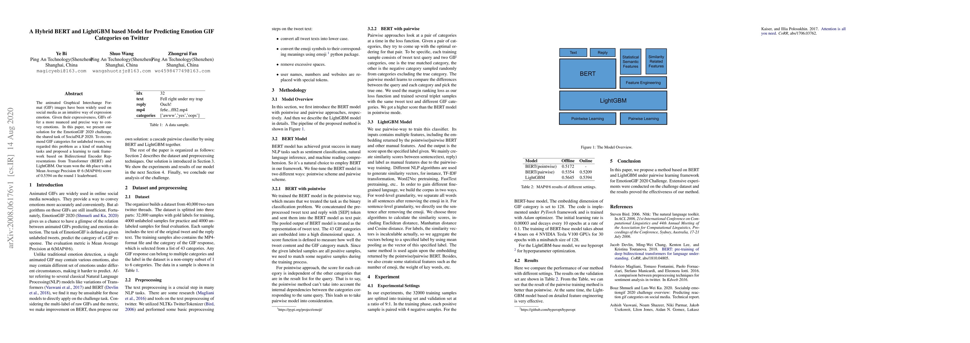 The animated Graphical Interchange Format (GIF) images have been widely used on social media as an intuitive way of expression emotion. Given their expressiveness, GIFs offer a more nuanced and precise way to convey emotions. In this paper, we present our solution for the EmotionGIF 2020 challenge, the shared task of SocialNLP 2020. To recommend GIF categories for unlabeled tweets, we regarded this problem as a kind of matching tasks and proposed a learning to rank framework based on Bidirectional Encoder Representations from Transformer (BERT) and LightGBM. Our team won the 4th place with a Mean Average Precision @ 6 (MAP@6) score of 0.5394 on the round 1 leaderboard.