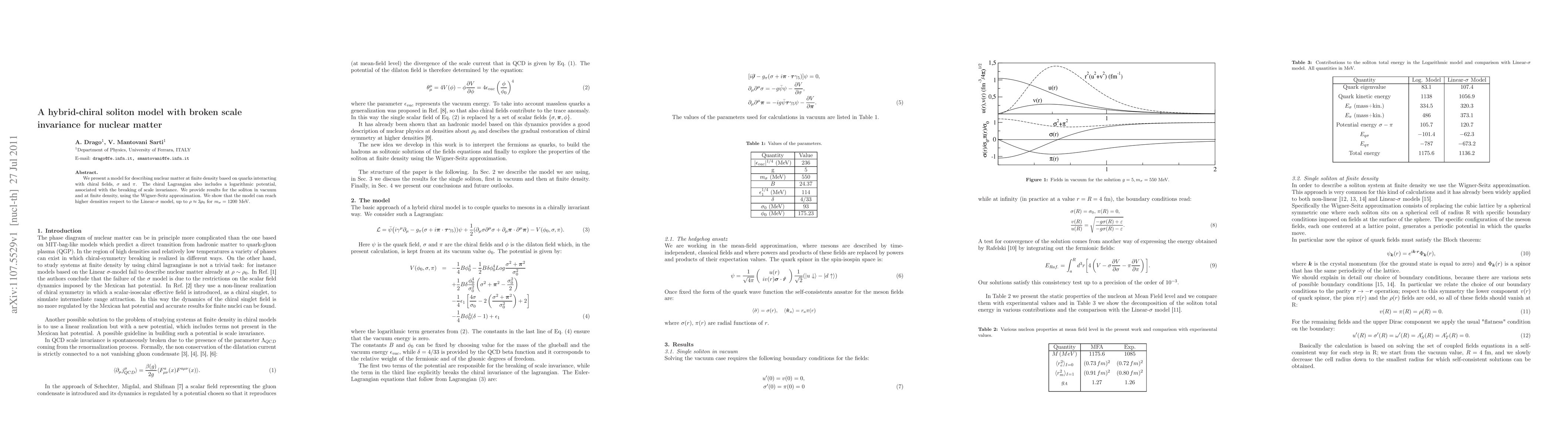 This paper proposes a hybrid-chiral soliton model for nuclear matter that incorporates quarks interacting with chiral fields and a logarithmic potential to break scale invariance. The model achieves higher densities than the Linear-sigma model, reaching up to 3 times the normal nuclear density.