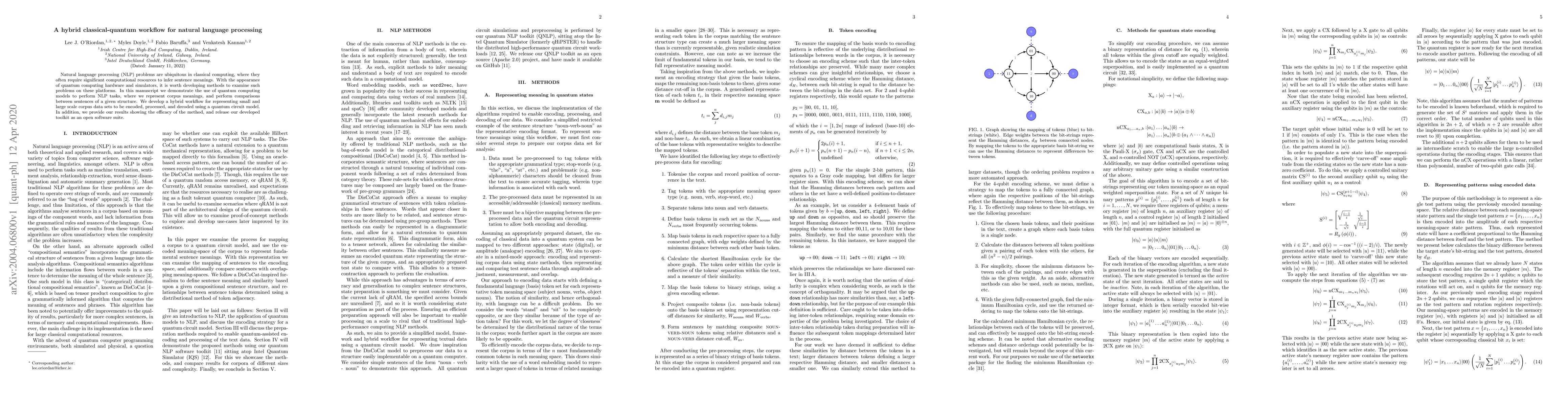 Natural language processing (NLP) problems are ubiquitous in classical computing, where they often require significant computational resources to infer sentence meanings. With the appearance of quantum computing hardware and simulators, it is worth developing methods to examine such problems on these platforms. In this manuscript we demonstrate the use of quantum computing models to perform NLP tasks, where we represent corpus meanings, and perform comparisons between sentences of a given structure. We develop a hybrid workflow for representing small and large scale corpus data sets to be encoded, processed, and decoded using a quantum circuit model. In addition, we provide our results showing the efficacy of the method, and release our developed toolkit as an open software suite.