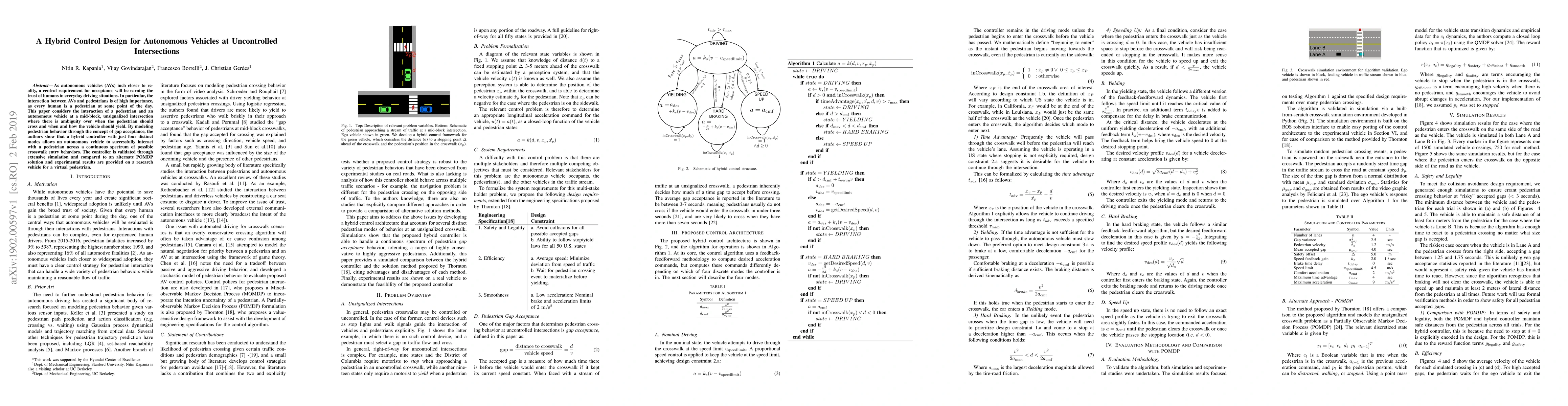 This paper proposes a hybrid control design for autonomous vehicles to navigate uncontrolled intersections, focusing on safe interactions with pedestrians. The hybrid controller, with four distinct modes, effectively manages the ambiguity in pedestrian crossing decisions, validated through simulations and experiments.