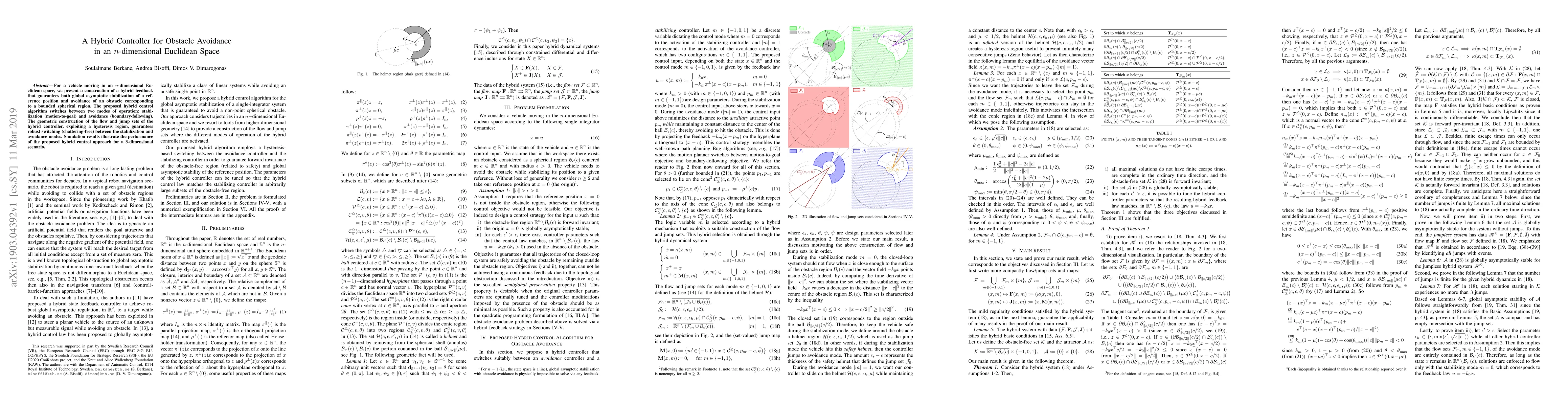 This paper proposes a hybrid controller for a vehicle navigating in an $n$-dimensional space, ensuring global stabilization and obstacle avoidance. The hybrid control algorithm seamlessly switches between stabilization and avoidance modes, leveraging a hysteresis region to avoid chattering, and is demonstrated through simulations in a 3D scenario.