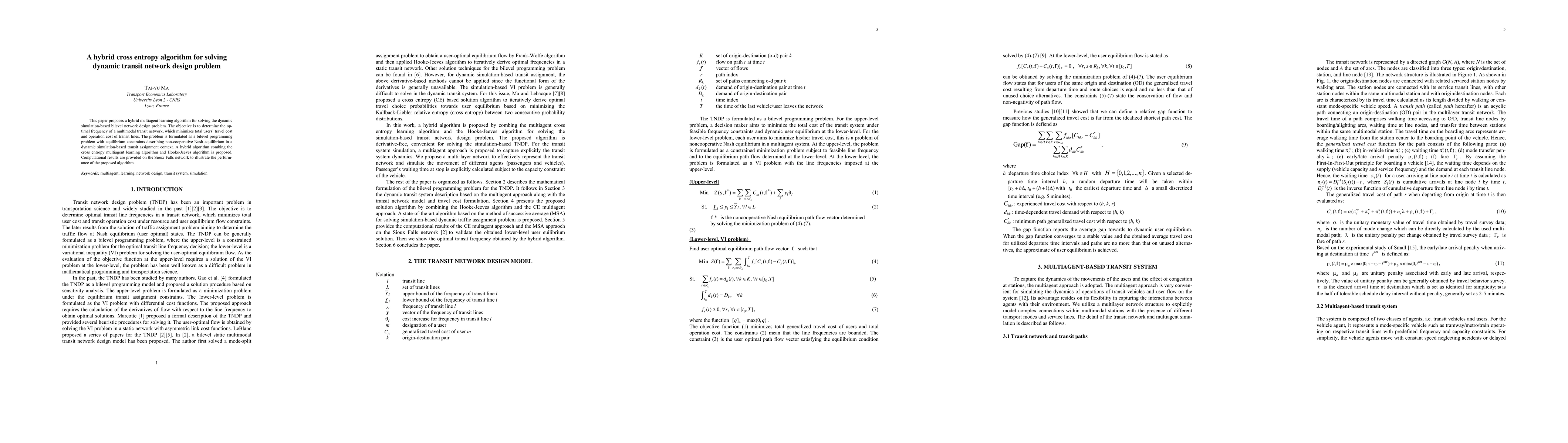 This paper proposes a hybrid multiagent learning algorithm for solving the dynamic simulation-based bilevel network design problem. The objective is to determine the op-timal frequency of a multimodal transit network, which minimizes total users' travel cost and operation cost of transit lines. The problem is formulated as a bilevel programming problem with equilibrium constraints describing non-cooperative Nash equilibrium in a dynamic simulation-based transit assignment context. A hybrid algorithm combing the cross entropy multiagent learning algorithm and Hooke-Jeeves algorithm is proposed. Computational results are provided on the Sioux Falls network to illustrate the perform-ance of the proposed algorithm.