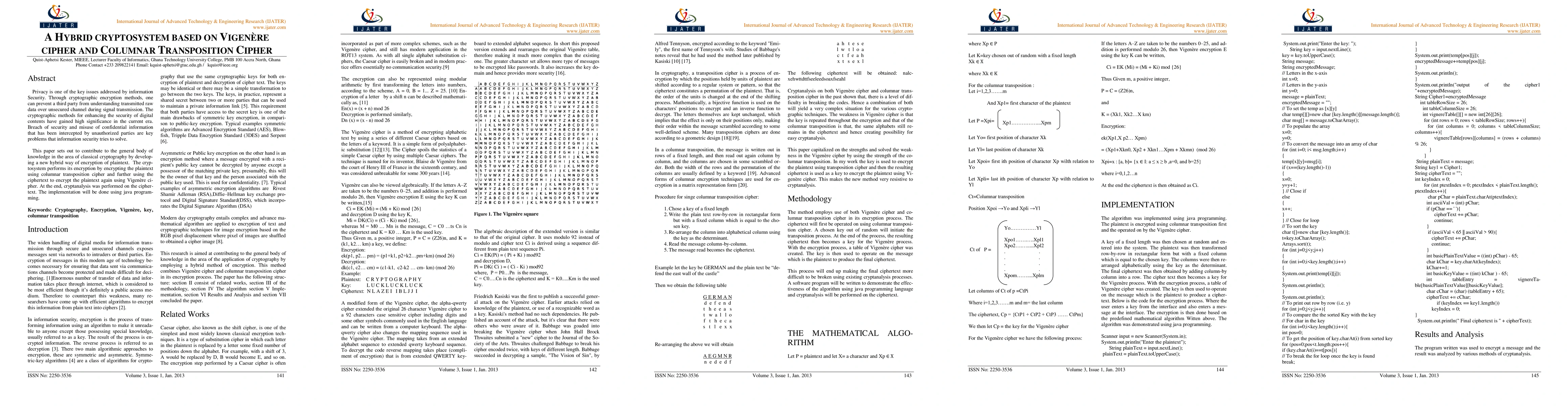 The paper presents a novel hybrid cryptosystem that combines Vigenère and columnar transposition ciphers, offering enhanced security through complex encryption processes.