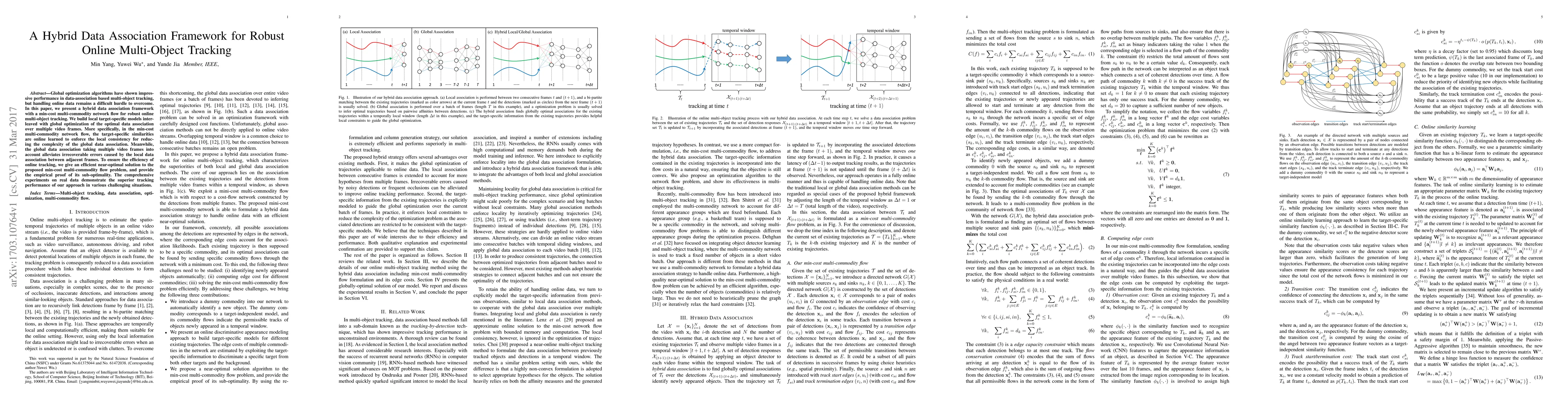 The paper proposes a hybrid data association framework for robust online multi-object tracking using a min-cost multi-commodity network flow. It combines local target-specific models with global optimization over multiple video frames, employing an efficient near-optimal solution to the min-cost multi-commodity flow problem.