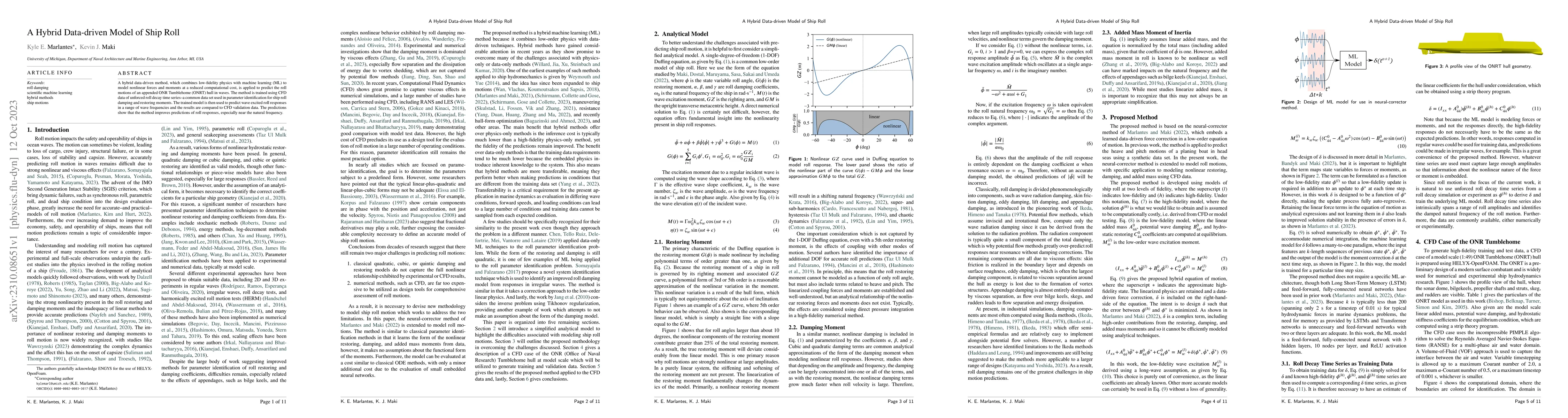 This paper proposes a hybrid data-driven model combining low-fidelity physics with machine learning to predict the roll motions of an ONRT hull in waves, showing improved accuracy, especially near natural frequency. The model is trained using CFD data and validated against CFD results.