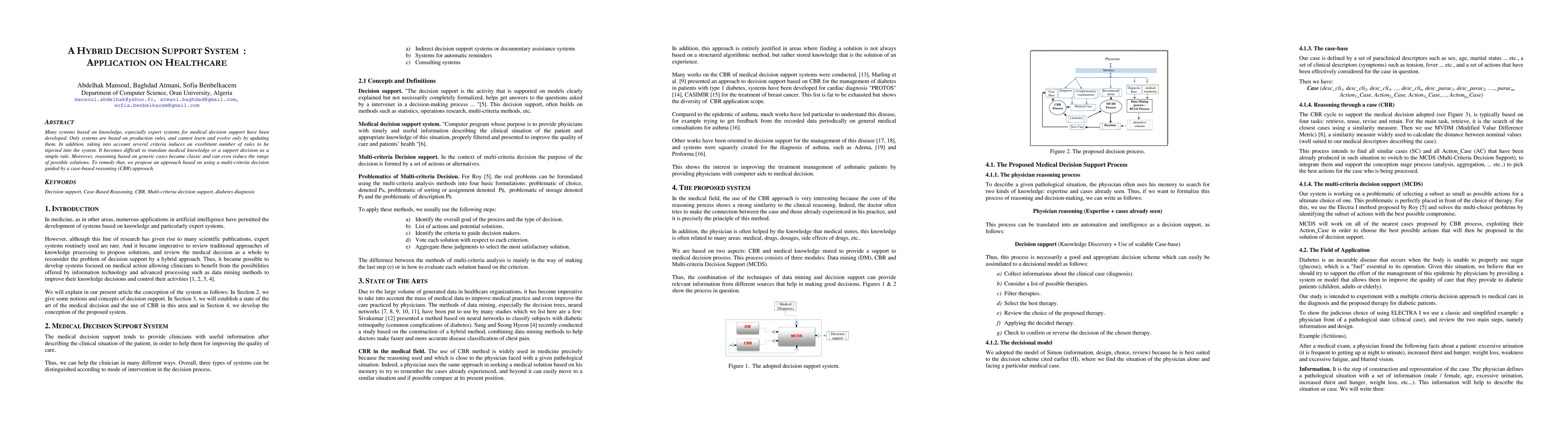 This paper proposes a hybrid decision support system for healthcare that combines multi-criteria decision analysis with case-based reasoning to improve medical decision-making, addressing the limitations of traditional rule-based expert systems. The approach aims to enhance adaptability and reduce the complexity of rule injection.