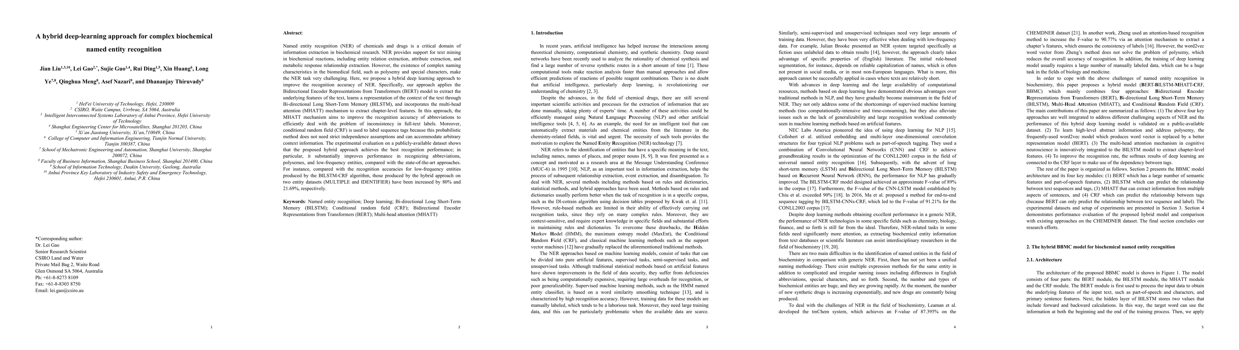 This paper proposes a hybrid deep learning approach for biochemical named entity recognition (NER) that combines BERT, BILSTM, MHATT, and CRF to improve recognition accuracy, especially for abbreviations, polysemes, and low-frequency entities. Experimental results show significant improvements over state-of-the-art methods, with notable increases in recognition accuracy for low-frequency entities.