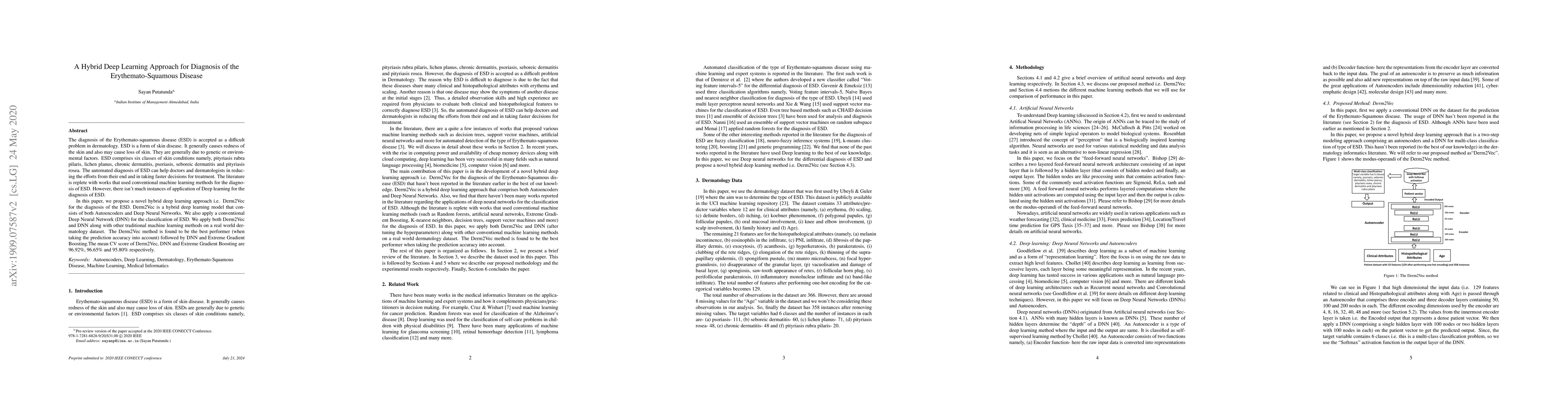 This paper proposes a hybrid deep learning approach called Derm2Vec for diagnosing Erythemato-squamous disease (ESD), a complex skin condition. Derm2Vec combines Autoencoders and Deep Neural Networks, outperforming traditional machine learning methods and a conventional Deep Neural Network (DNN) on a dermatology dataset, achieving a mean cross-validated accuracy of 96.92%.