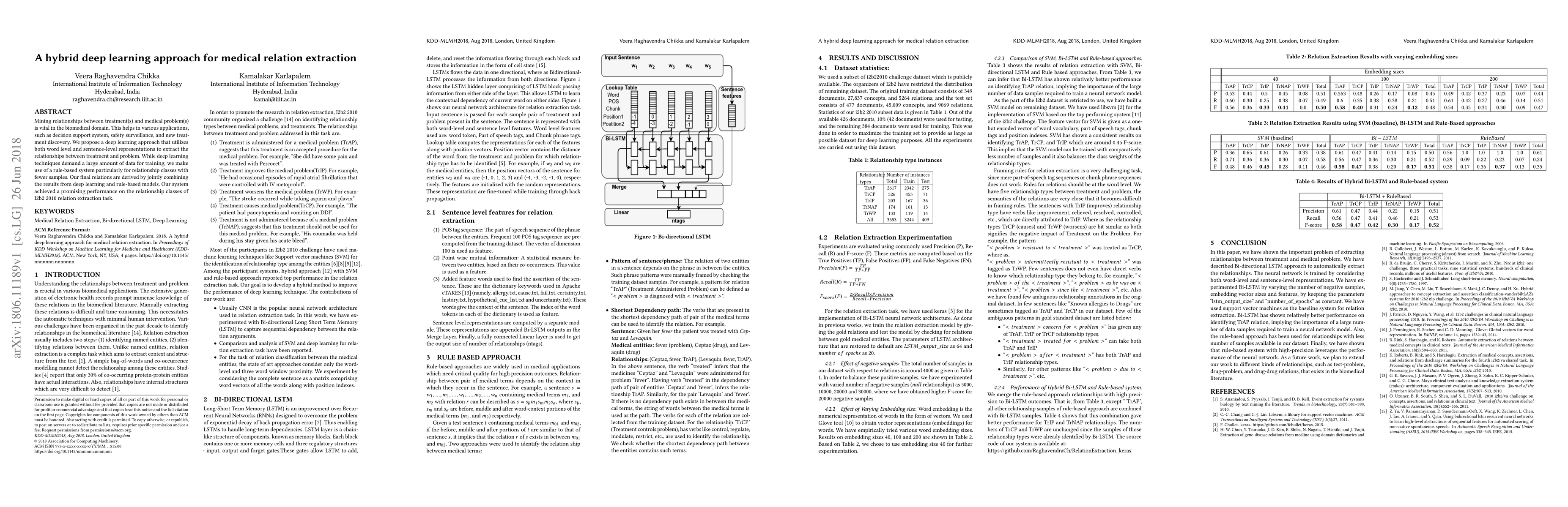 Mining relationships between treatment(s) and medical problem(s) is vital in the biomedical domain. This helps in various applications, such as decision support system, safety surveillance, and new treatment discovery. We propose a deep learning approach that utilizes both word level and sentence-level representations to extract the relationships between treatment and problem. While deep learning techniques demand a large amount of data for training, we make use of a rule-based system particularly for relationship classes with fewer samples. Our final relations are derived by jointly combining the results from deep learning and rule-based models. Our system achieved a promising performance on the relationship classes of I2b2 2010 relation extraction task.