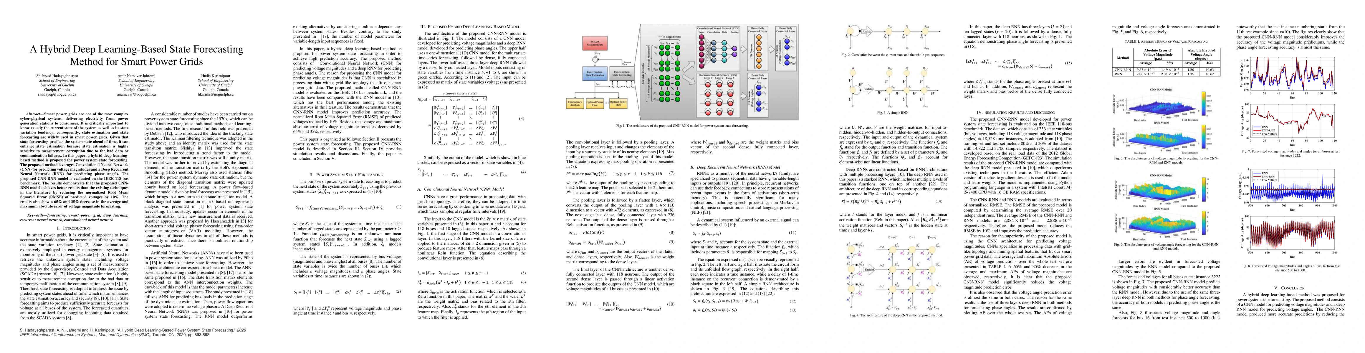 This paper proposes a hybrid deep learning method combining CNN and RNN for forecasting the state of smart power grids, achieving better accuracy than existing techniques. The CNN-RNN model reduces the normalized RMSE of voltage predictions by 10% and decreases average and maximum absolute errors by 65% and 35%, respectively.