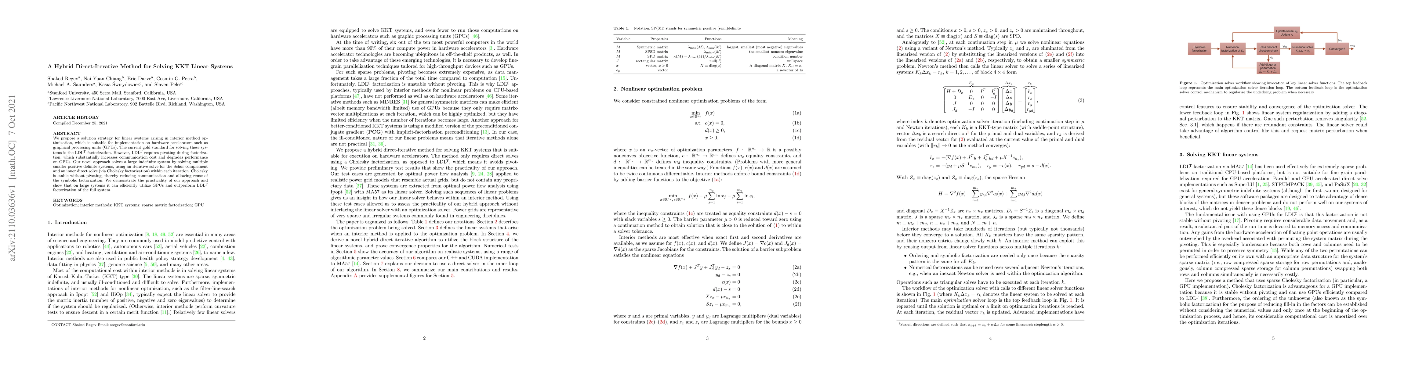 This paper proposes a hybrid direct-iterative method for solving large KKT linear systems in optimization, designed for GPU implementation. It avoids the communication costs of pivoting in LDL^T factorization by iteratively solving smaller positive definite systems, leveraging Cholesky factorization for stability and efficiency, and demonstrates superior performance on GPUs.