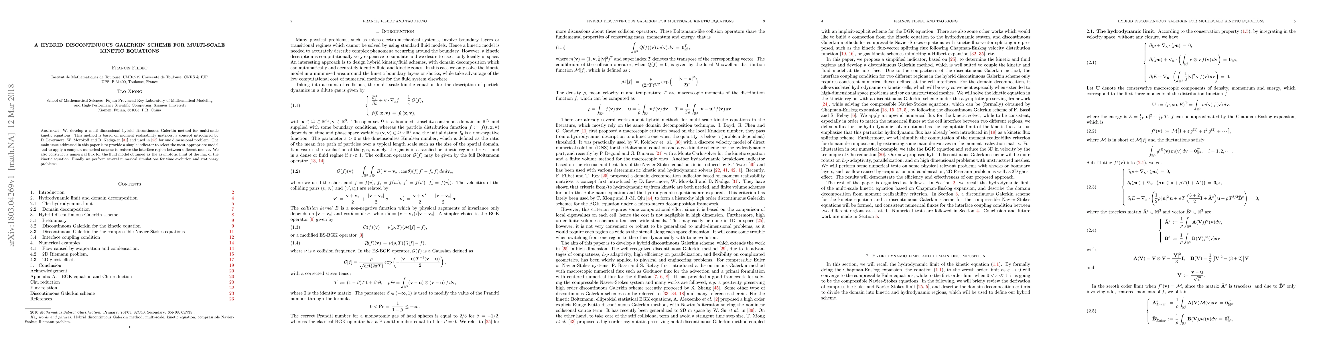 This paper introduces a hybrid discontinuous Galerkin scheme for solving multi-scale kinetic equations, utilizing moment realizability matrices to select appropriate models and reduce interface regions. The study also constructs a numerical flux for the fluid model derived from the kinetic equation's asymptotic limit, followed by numerical simulations for both time evolution and stationary problems.