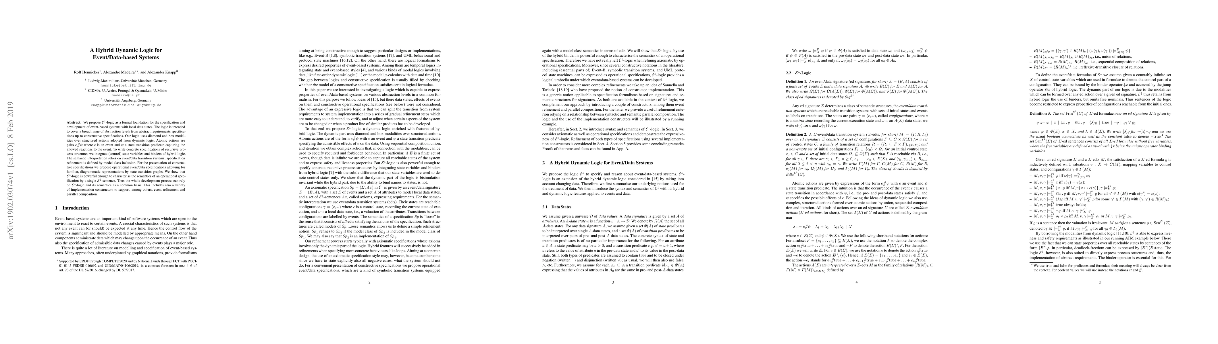 The paper proposes $\mathcal{E}^{\downarrow}$-logic as a formal foundation for event/data-based systems, integrating dynamic logic modalities and hybrid logic binders for specification and development. It demonstrates the logic's capability to characterize operational specifications and supports implementation constructs like event refinement and parallel composition.