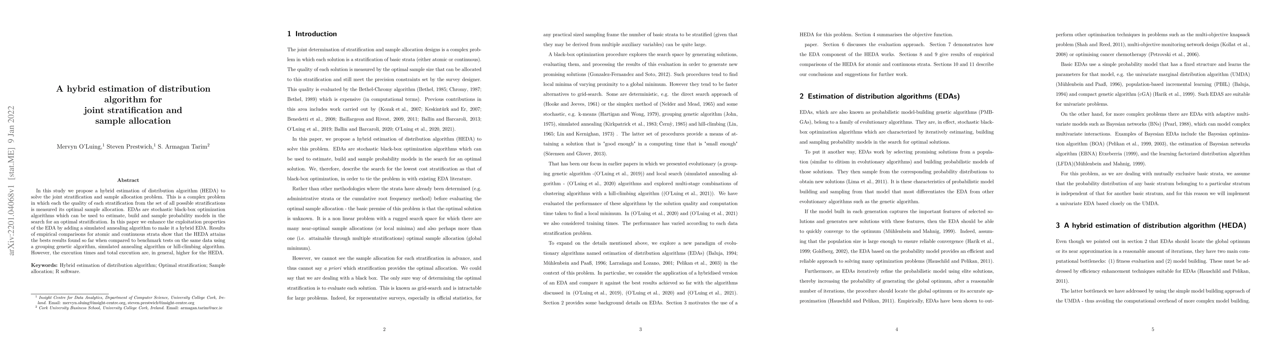 This paper introduces a hybrid estimation of distribution algorithm (HEDA) that combines EDA with simulated annealing to solve the joint stratification and sample allocation problem. Empirical results show HEDA outperforms other methods in finding optimal stratifications, though it generally requires more execution time.