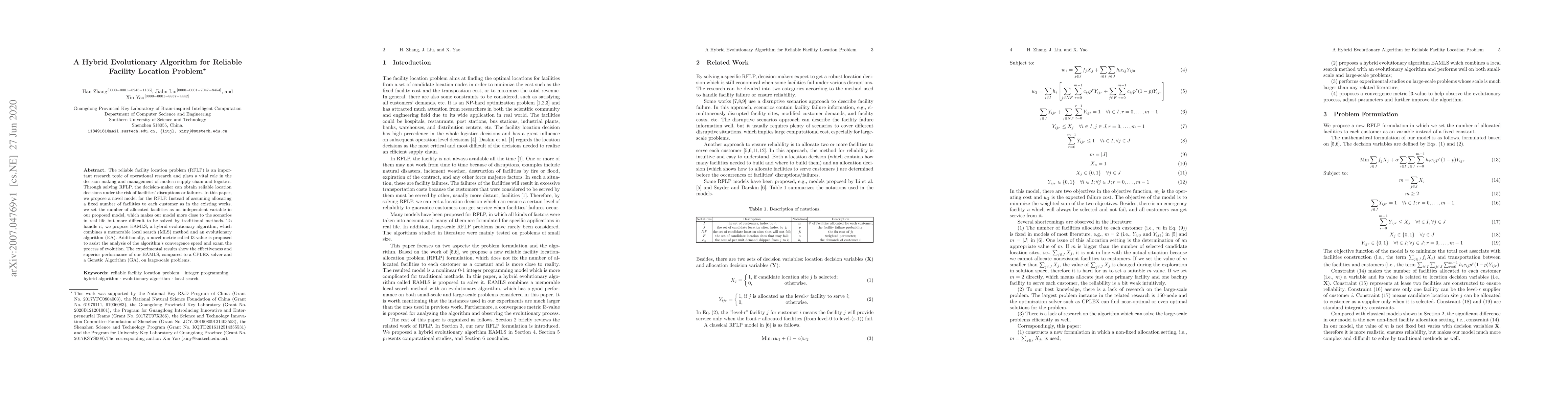 This paper proposes a hybrid evolutionary algorithm, EAMLS, to solve the reliable facility location problem (RFLP) by allowing the number of allocated facilities to vary. The algorithm combines memorable local search and evolutionary techniques, and a new l3-value metric is introduced to analyze convergence. Experimental results demonstrate EAMLS's superior performance over CPLEX and Genetic Algorithm on large-scale instances.