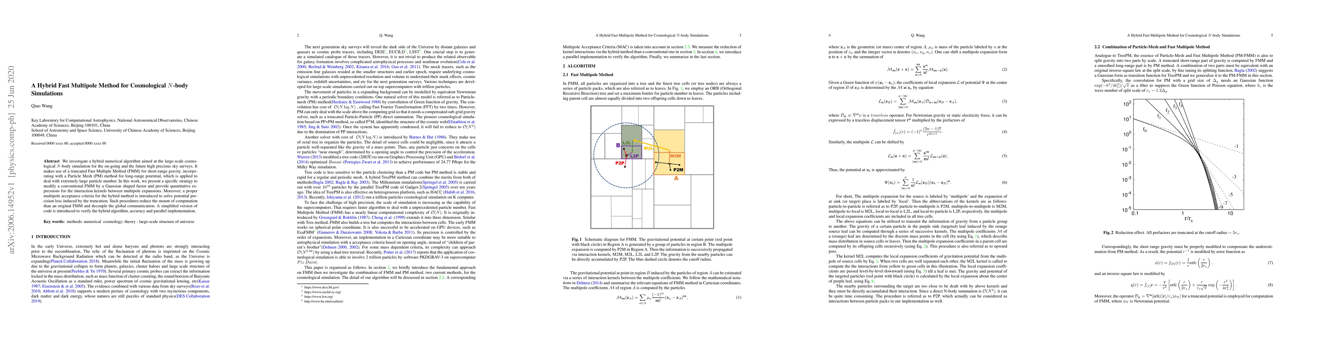 This paper proposes a hybrid numerical algorithm combining truncated Fast Multipole Method (FMM) for short-range gravity and Particle Mesh (PM) for long-range potential in large-scale cosmological N-body simulations. The hybrid approach enhances computational efficiency and addresses precision loss through modified interaction kernels and multipole acceptance criteria.