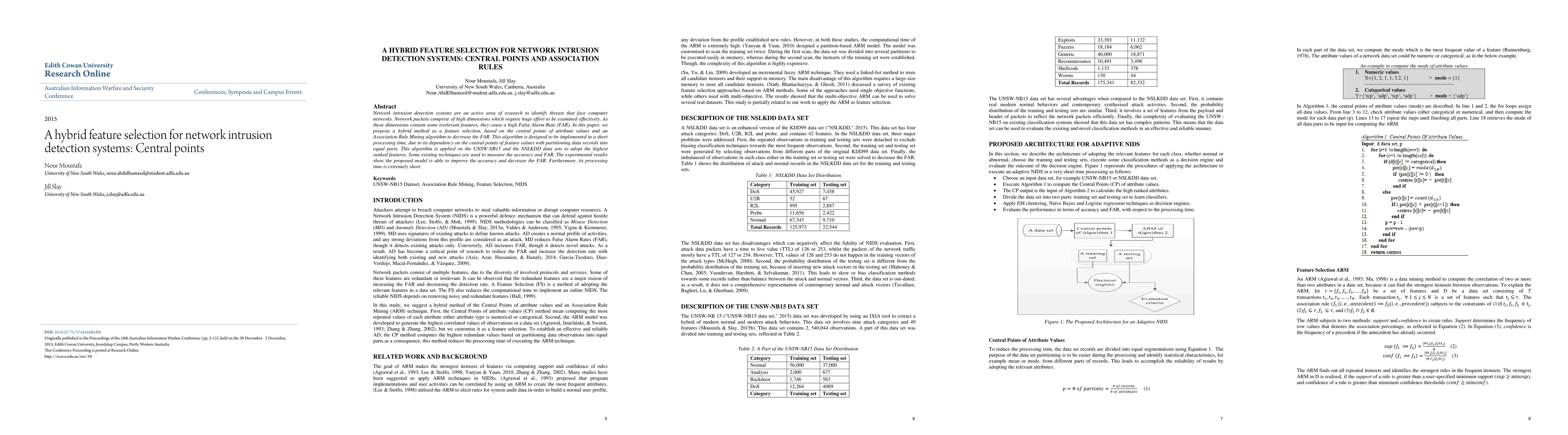 This paper proposes a hybrid feature selection method for network intrusion detection systems, combining central points of attribute values and an Association Rule Mining algorithm to reduce the False Alarm Rate (FAR) while minimizing processing time. Experimental results on UNSW-NB15 and NSLKDD datasets demonstrate improved accuracy and decreased FAR with a notably short processing time.