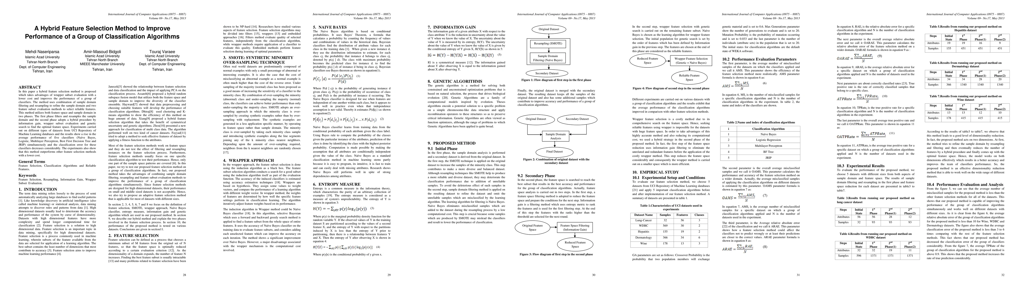 In this paper a hybrid feature selection method is proposed which takes advantages of wrapper subset evaluation with a lower cost and improves the performance of a group of classifiers. The method uses combination of sample domain filtering and resampling to refine the sample domain and two feature subset evaluation methods to select reliable features. This method utilizes both feature space and sample domain in two phases. The first phase filters and resamples the sample domain and the second phase adopts a hybrid procedure by information gain, wrapper subset evaluation and genetic search to find the optimal feature space. Experiments carried out on different types of datasets from UCI Repository of Machine Learning databases and the results show a rise in the average performance of five classifiers (Naive Bayes, Logistic, Multilayer Perceptron, Best First Decision Tree and JRIP) simultaneously and the classification error for these classifiers decreases considerably. The experiments also show that this method outperforms other feature selection methods with a lower cost.