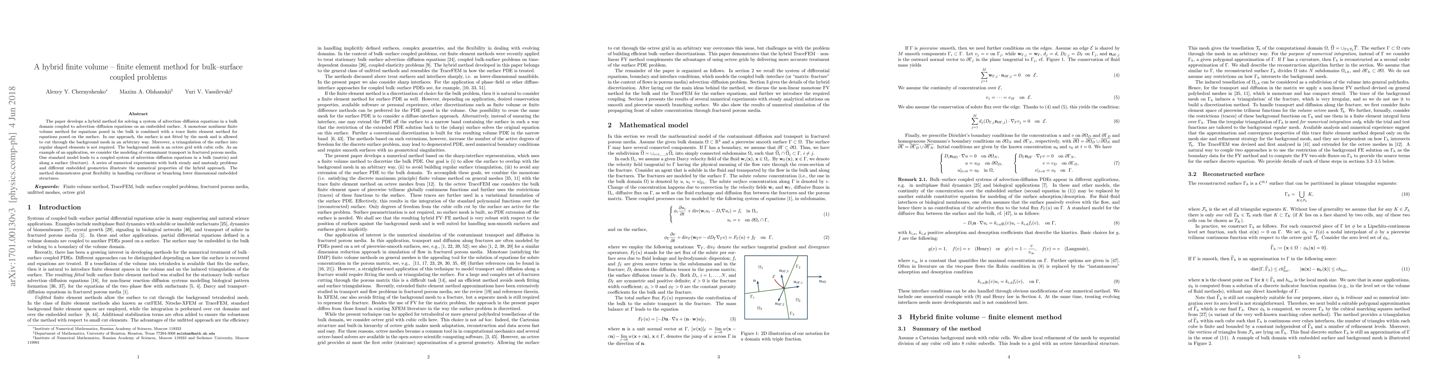 This paper introduces a hybrid finite volume-finite element method for solving advection-diffusion equations in bulk and surface domains, allowing the surface to cut through the mesh without fitting. The method is applied to model contaminant transport in fractured porous media, demonstrating flexibility in handling complex geometries.
