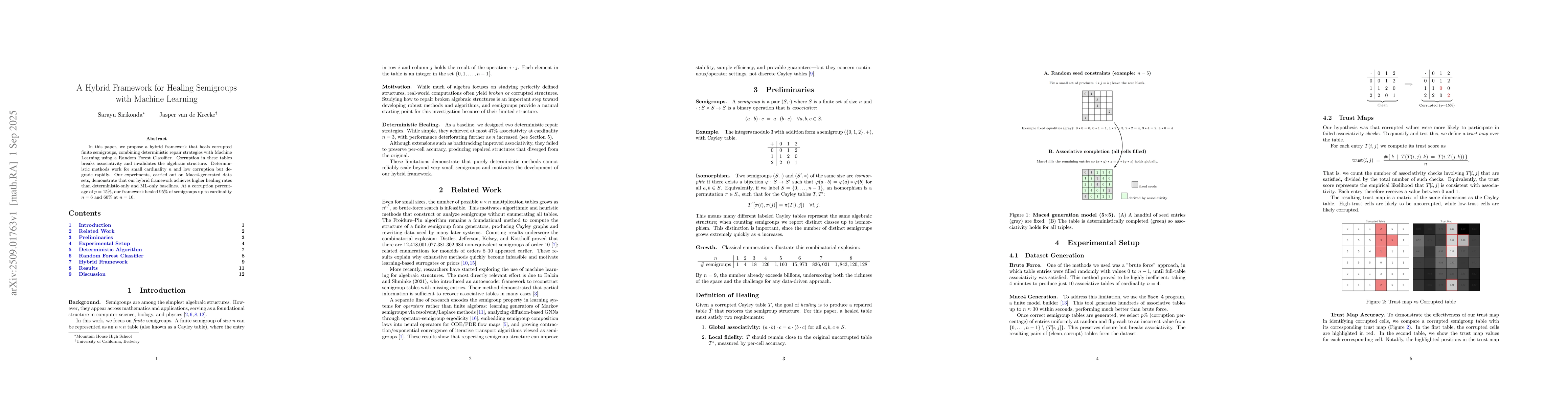 In this paper, we propose a hybrid framework that heals corrupted finite semigroups, combining deterministic repair strategies with Machine Learning using a Random Forest Classifier. Corruption in these tables breaks associativity and invalidates the algebraic structure. Deterministic methods work for small cardinality n and low corruption but degrade rapidly. Our experiments, carried out on Mace4-generated data sets, demonstrate that our hybrid framework achieves higher healing rates than deterministic-only and ML-only baselines. At a corruption percentage of p=15%, our framework healed 95% of semigroups up to cardinality n=6 and 60% at n=10.