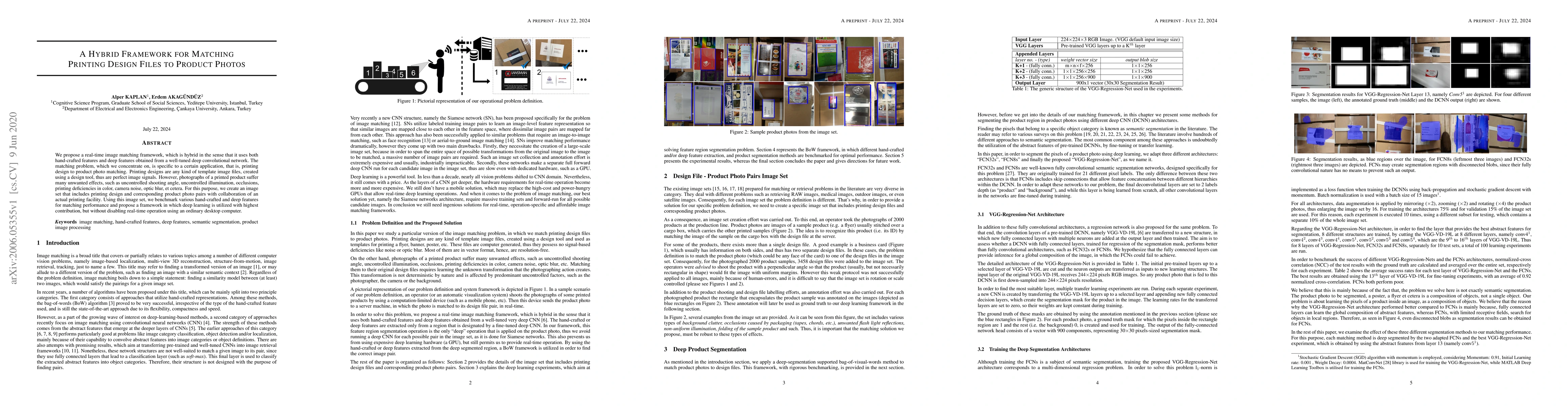 A hybrid framework for matching printing design files to product photos uses both hand-crafted features and deep learning features to achieve real-time image matching. The framework achieves high performance without sacrificing real-time operation on ordinary desktop computers.