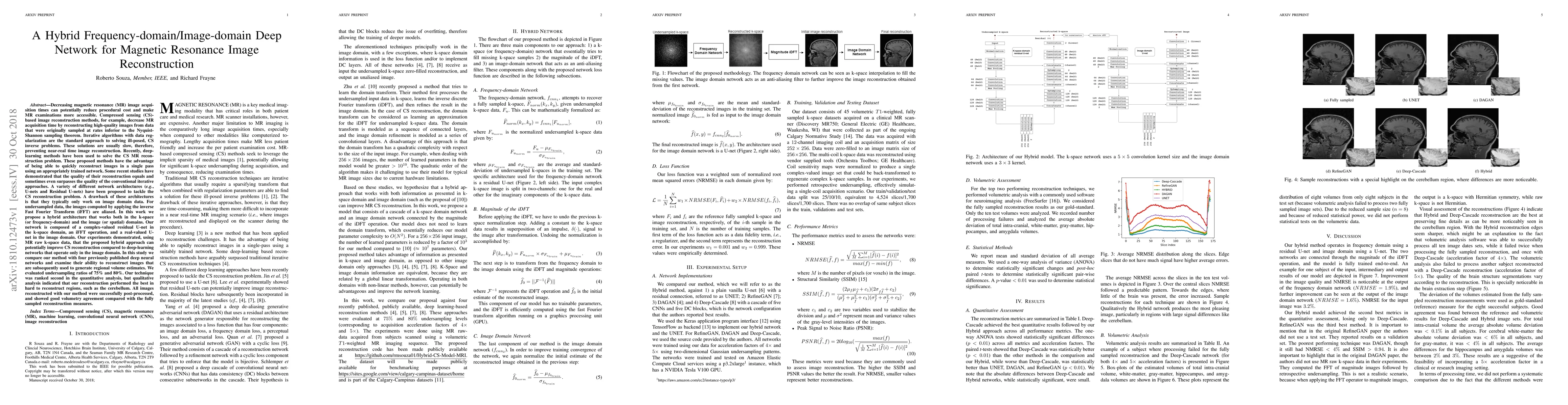 This paper proposes a hybrid deep network that combines frequency-domain and image-domain techniques for compressed sensing-based magnetic resonance image reconstruction. The method, which includes a complex-valued U-net in k-space and a real-valued U-net in the image domain, showed improved performance in reconstructing difficult regions, despite ranking second in quantitative metrics.