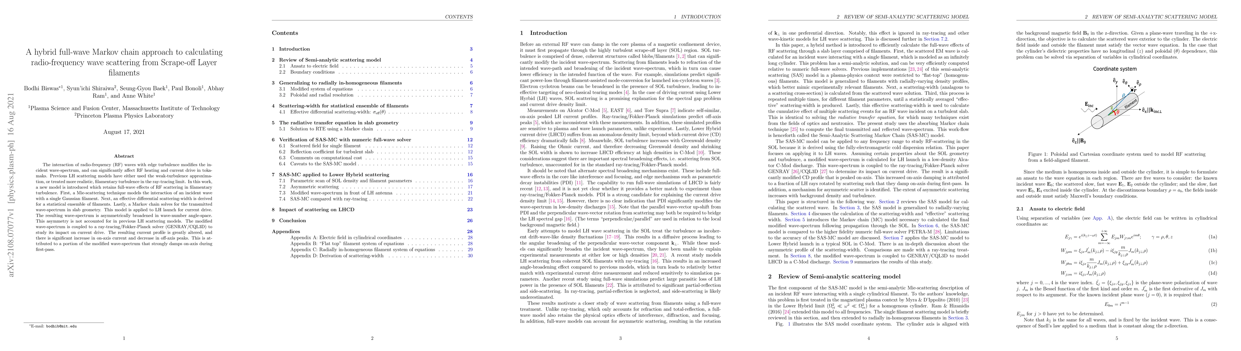 The interaction of radio-frequency (RF) waves with edge turbulence modifies the incident wave-spectrum, and can significantly affect RF heating and current drive in tokamaks. Previous LH scattering models have either used the weak-turbulence approximation, or treated more realistic, filamentary turbulence in the ray-tracing limit. In this work, a new model is introduced which retains full-wave effects of RF scattering in filamentary turbulence. First, a Mie-scattering technique models the interaction of an incident wave with a single Gaussian filament. Next, an effective differential scattering-width is derived for a statistical ensemble of filaments. Lastly, a Markov chain solves for the transmitted wave-spectrum in slab geometry. This model is applied to LH launch for current drive. The resulting wave-spectrum is asymmetrically broadened in wave-number angle-space. This asymmetry is not accounted for in previous LH scattering models. The modified wave-spectrum is coupled to a ray-tracing/Fokker-Planck solver (GENRAY/CQL3D) to study its impact on current drive. The resulting current profile is greatly altered, and there is significant increase in on-axis current and decrease in off-axis peaks. This is attributed to a portion of the modified wave-spectrum that strongly damps on-axis during first-pass.