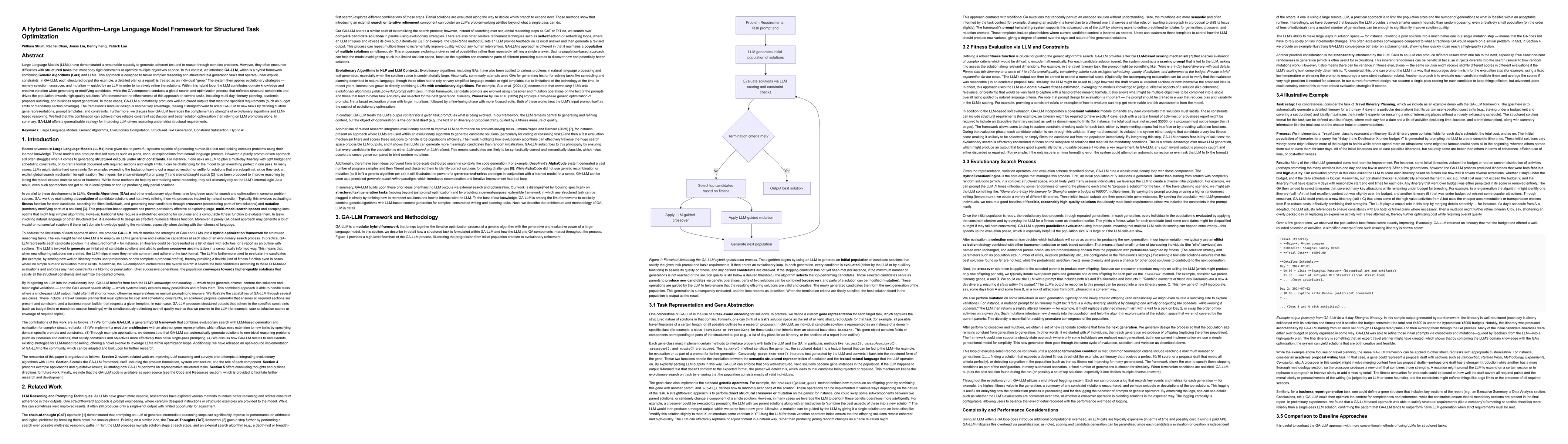 A Hybrid GA LLM Framework combines Genetic Algorithms with Large Language Models for structured task optimization, achieving better constraint satisfaction and higher quality solutions than using a language model alone.