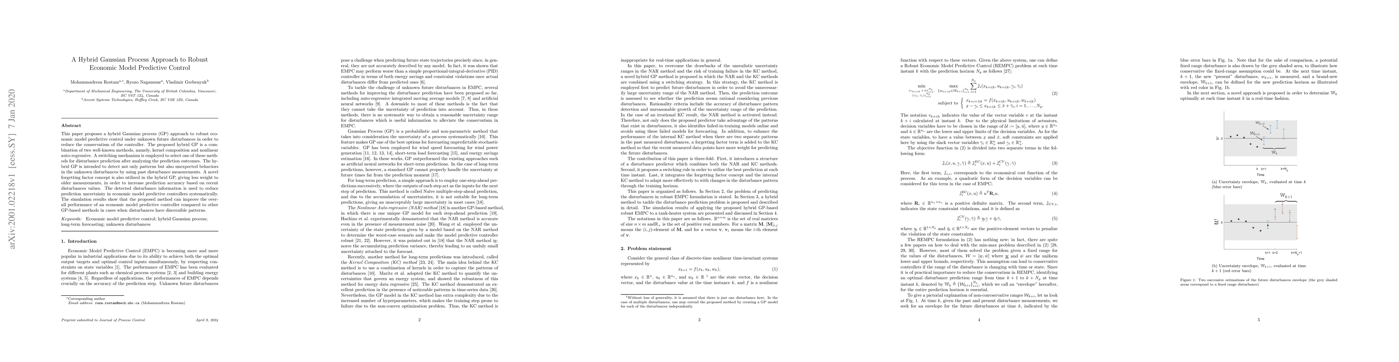 A hybrid Gaussian process approach is proposed to improve robustness in economic model predictive control under unknown future disturbances. The method combines two methods to detect patterns and unexpected behaviors in disturbances, with a forgetting factor for increased prediction accuracy.