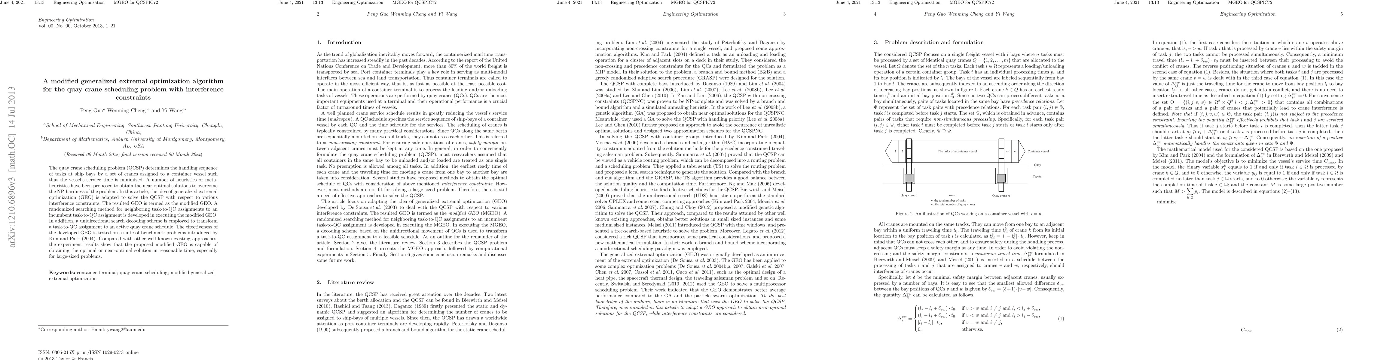 This paper proposes a hybrid generalized extremal optimization algorithm to solve the quay crane scheduling problem (QCSP) under interference constraints, demonstrating its effectiveness through benchmark tests and comparing it favorably against existing methods. The developed modified GEO algorithm efficiently minimizes vessel service time by optimizing task-to-crane assignments.