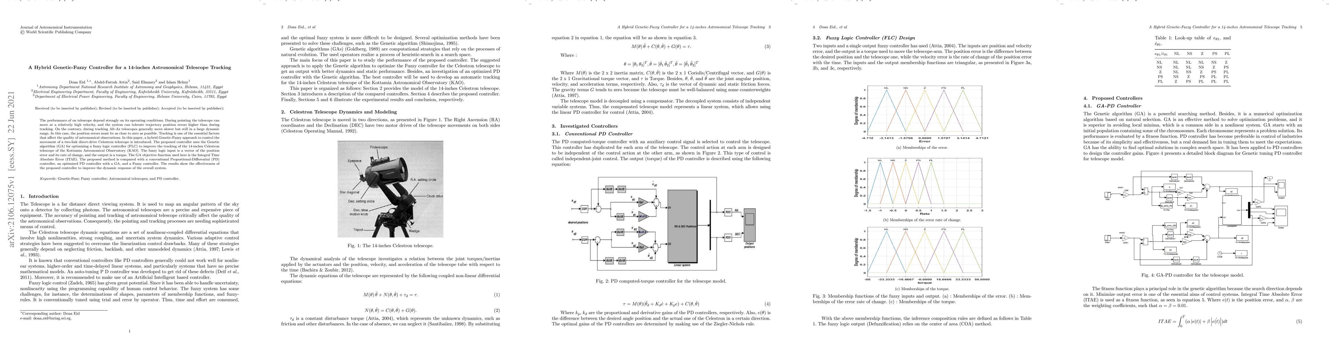 This paper introduces a hybrid Genetic-Fuzzy controller to enhance the tracking performance of a 14-inch Celestron telescope. The proposed controller optimizes a fuzzy logic controller using a Genetic algorithm to minimize position errors during tracking, outperforming conventional and optimized Proportional-Differential controllers.