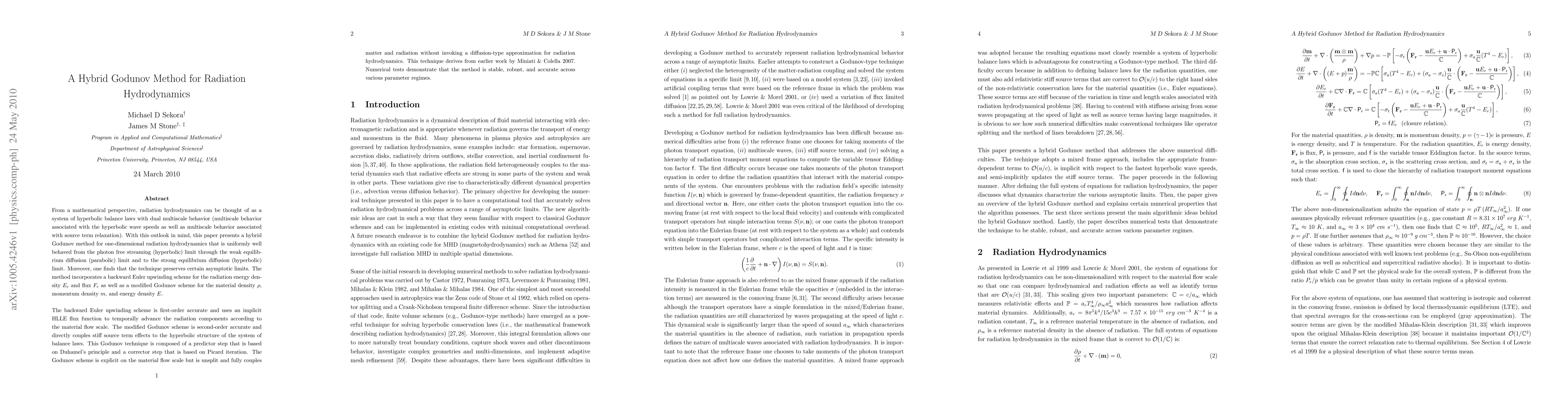 A new hybrid Godunov method is presented for radiation hydrodynamics, combining backward Euler upwinding for radiation energy density and flux with a modified Godunov scheme for matter and momentum, demonstrating stability, robustness, and accuracy across various parameter regimes.