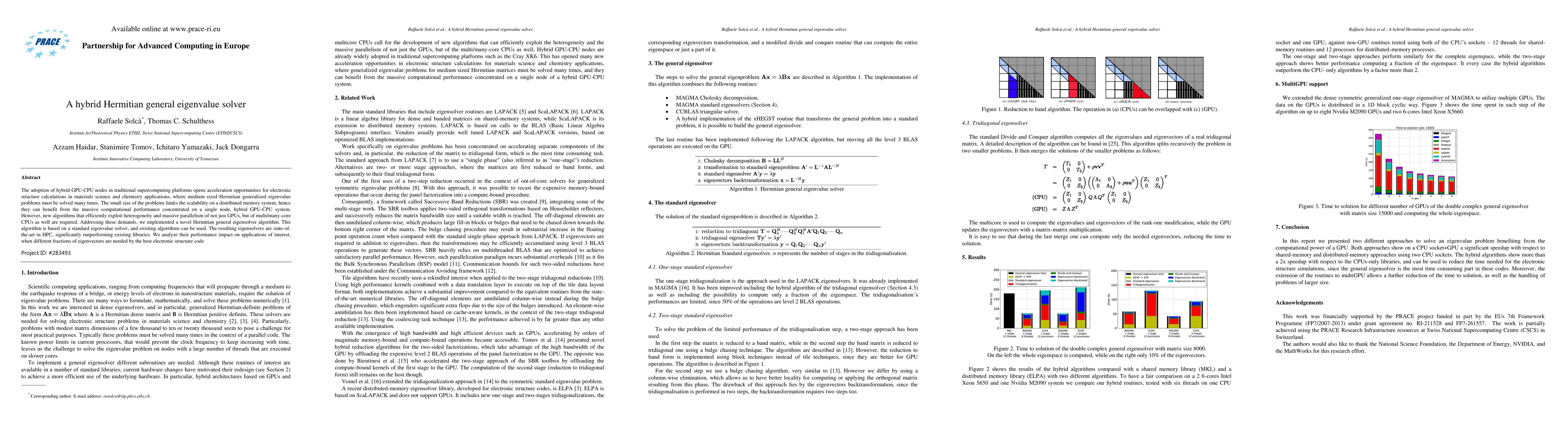 This paper presents a hybrid GPU-CPU eigensolver algorithm designed to accelerate Hermitian generalized eigenvalue problems in materials science and chemistry. The proposed algorithm leverages the computational power of both GPUs and multi/many-core CPUs, outperforming existing libraries and significantly enhancing the performance of electronic structure calculations.