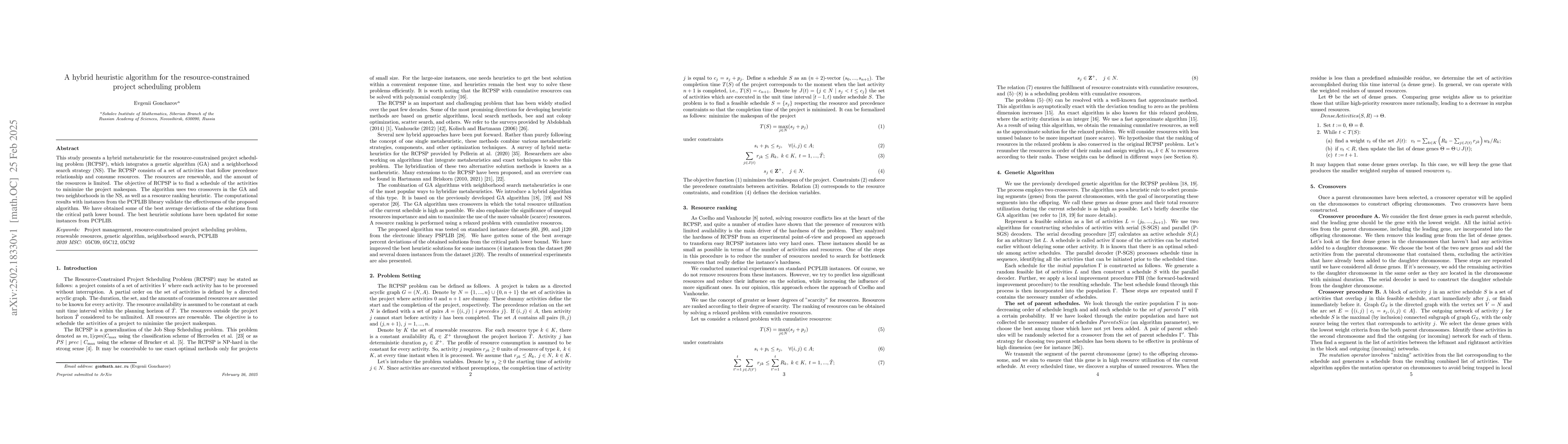 The research proposes a hybrid metaheuristic algorithm for the resource-constrained project scheduling problem (RCPSP), combining a genetic algorithm (GA) with a neighborhood search strategy (NS). It uses two crossovers in the GA, two neighborhoods in the NS, and a resource ranking heuristic.