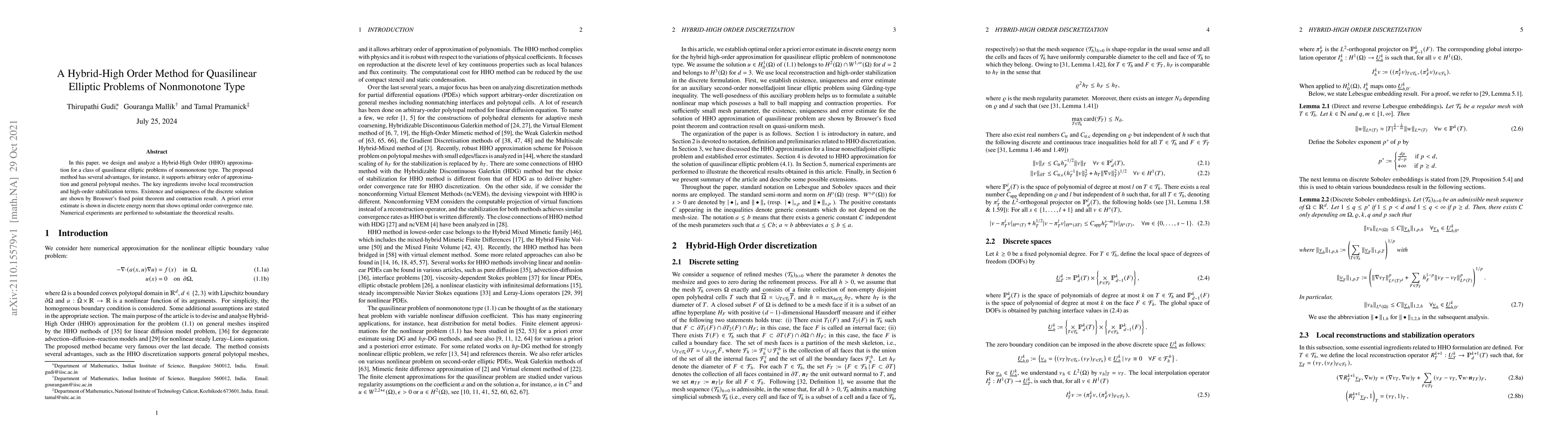 A new Hybrid-High Order method is proposed for solving quasilinear elliptic problems with nonmonotone type, offering optimal order convergence rate and support for arbitrary mesh refinement.