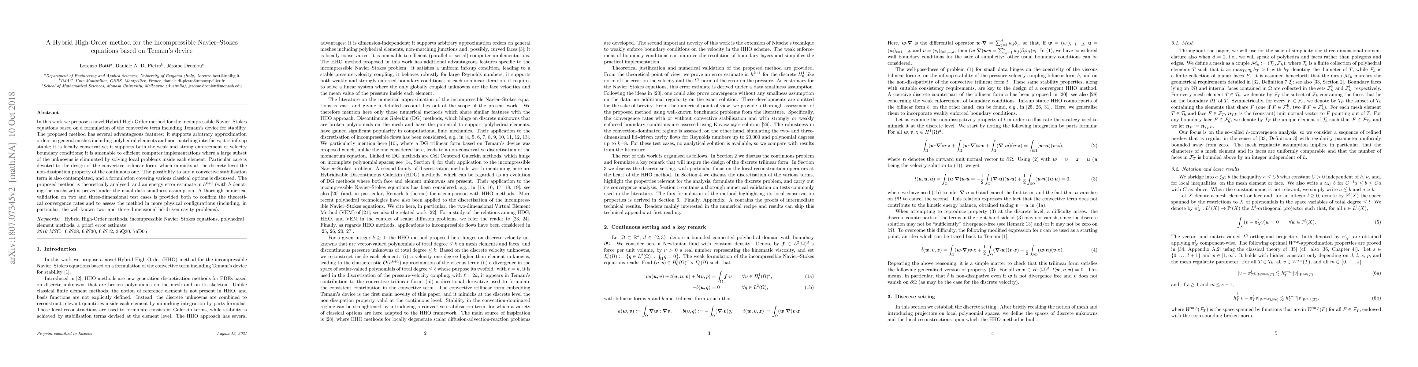 In this work we propose a novel Hybrid High-Order method for the incompressible Navier--Stokes equations based on a formulation of the convective term including Temam's device for stability. The proposed method has several advantageous features: it supports arbitrary approximation orders on general meshes including polyhedral elements and non-matching interfaces; it is inf-sup stable; it is locally conservative; it supports both the weak and strong enforcement of velocity boundary conditions; it is amenable to efficient computer implementations where a large subset of the unknowns is eliminated by solving local problems inside each element. Particular care is devoted to the design of the convective trilinear form, which mimicks at the discrete level the non-dissipation property of the continuous one. The possibility to add a convective stabilisation term is also contemplated, and a formulation covering various classical options is discussed. The proposed method is theoretically analysed, and an energy error estimate in $h^{k+1}$ (with $h$ denoting the meshsize) is proved under the usual data smallness assumption. A thorough numerical validation on two and three-dimensional test cases is provided both to confirm the theoretical convergence rates and to assess the method in more physical configurations (including, in particular, the well-known two- and three-dimensional lid-driven cavity problems).