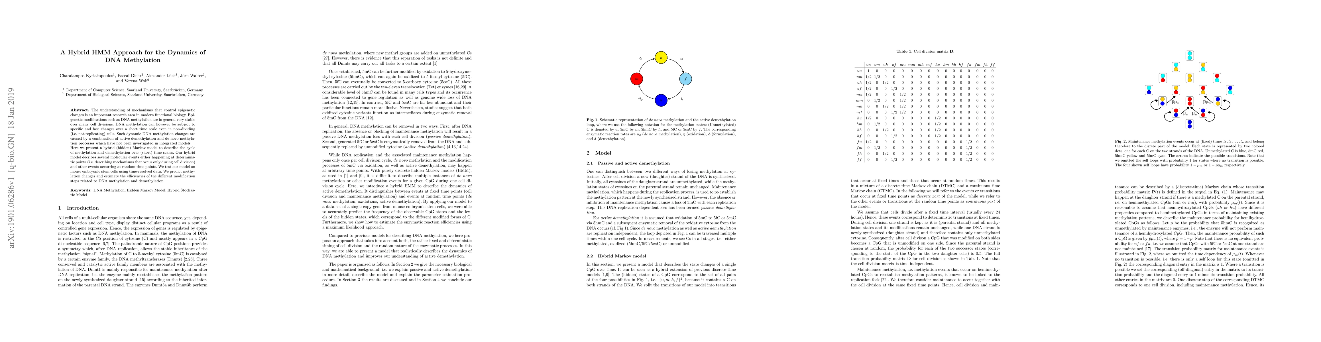 The understanding of mechanisms that control epigenetic changes is an important research area in modern functional biology. Epigenetic modifications such as DNA methylation are in general very stable over many cell divisions. DNA methylation can however be subject to specific and fast changes over a short time scale even in non-dividing (i.e. not-replicating) cells. Such dynamic DNA methylation changes are caused by a combination of active demethylation and de novo methylation processes which have not been investigated in integrated models. Here we present a hybrid (hidden) Markov model to describe the cycle of methylation and demethylation over (short) time scales. Our hybrid model decribes several molecular events either happening at deterministic points (i.e. describing mechanisms that occur only during cell division) and other events occurring at random time points. We test our model on mouse embryonic stem cells using time-resolved data. We predict methylation changes and estimate the efficiencies of the different modification steps related to DNA methylation and demethylation.