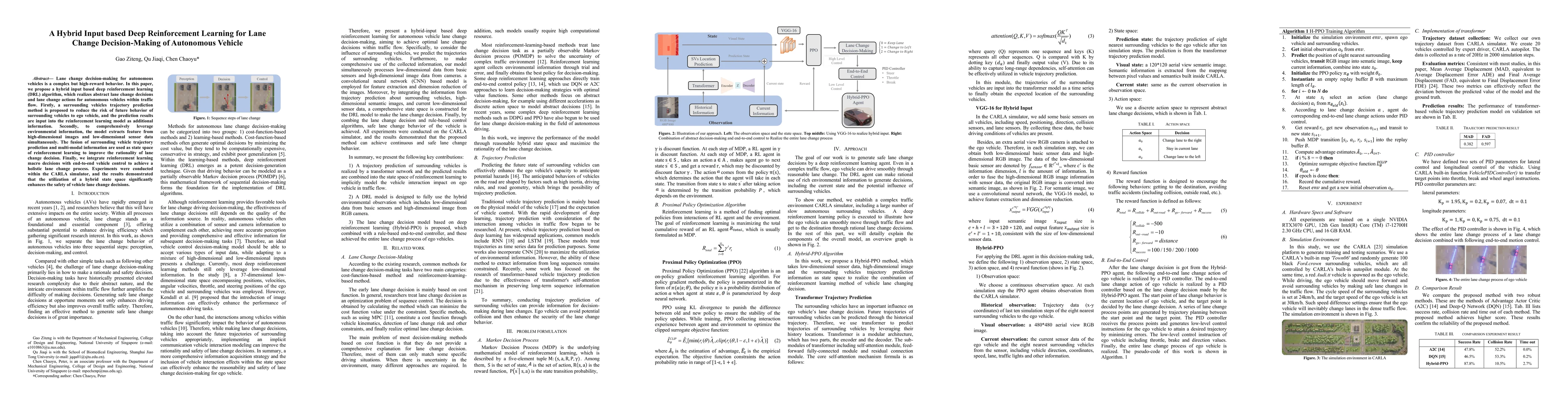 Lane change decision-making for autonomous vehicles is a complex but high-reward behavior. In this paper, we propose a hybrid input based deep reinforcement learning (DRL) algorithm, which realizes abstract lane change decisions and lane change actions for autonomous vehicles within traffic flow. Firstly, a surrounding vehicles trajectory prediction method is proposed to reduce the risk of future behavior of surrounding vehicles to ego vehicle, and the prediction results are input into the reinforcement learning model as additional information. Secondly, to comprehensively leverage environmental information, the model extracts feature from high-dimensional images and low-dimensional sensor data simultaneously. The fusion of surrounding vehicle trajectory prediction and multi-modal information are used as state space of reinforcement learning to improve the rationality of lane change decision. Finally, we integrate reinforcement learning macro decisions with end-to-end vehicle control to achieve a holistic lane change process. Experiments were conducted within the CARLA simulator, and the results demonstrated that the utilization of a hybrid state space significantly enhances the safety of vehicle lane change decisions.