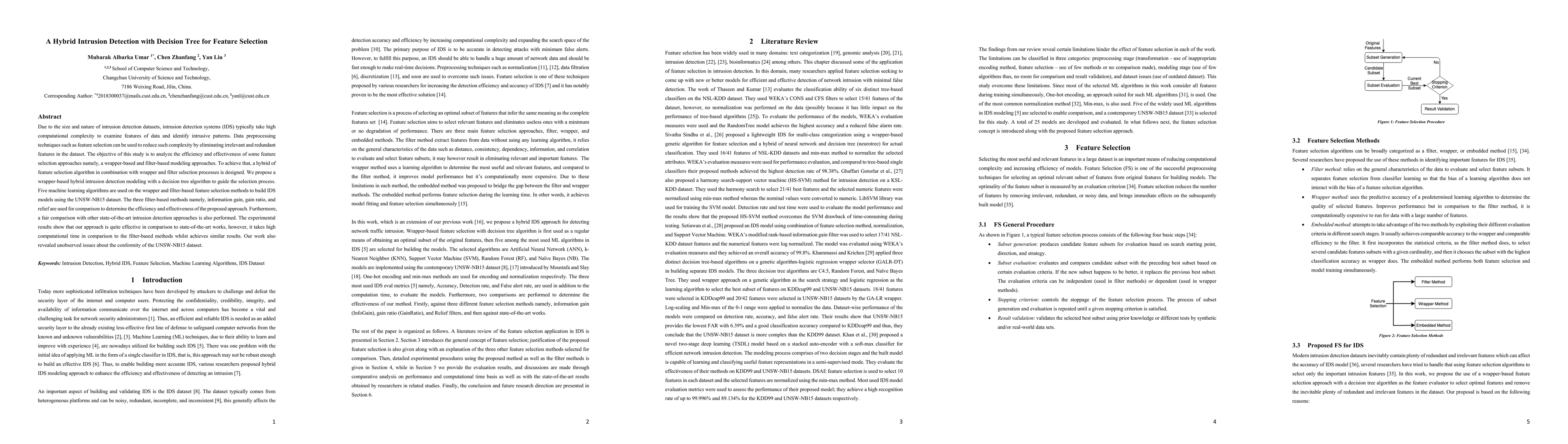 This paper proposes a hybrid intrusion detection system using a decision tree for feature selection, combining wrapper and filter-based methods to reduce computational complexity. Experimental results show the hybrid approach is effective but computationally intensive compared to filter-based methods, while also highlighting issues with the UNSW-NB15 dataset.