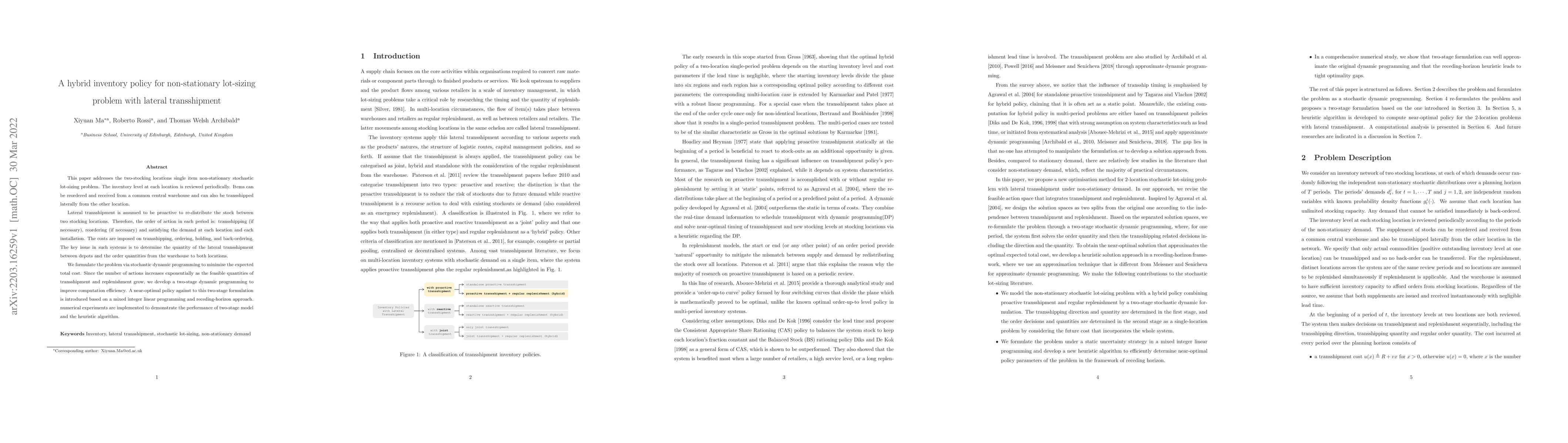 This paper develops a hybrid inventory policy for a non-stationary lot-sizing problem involving two stocking locations with lateral transshipment, using stochastic dynamic programming to minimize total cost. A two-stage approach and a heuristic algorithm are introduced to manage computational efficiency and demonstrate performance through numerical experiments.