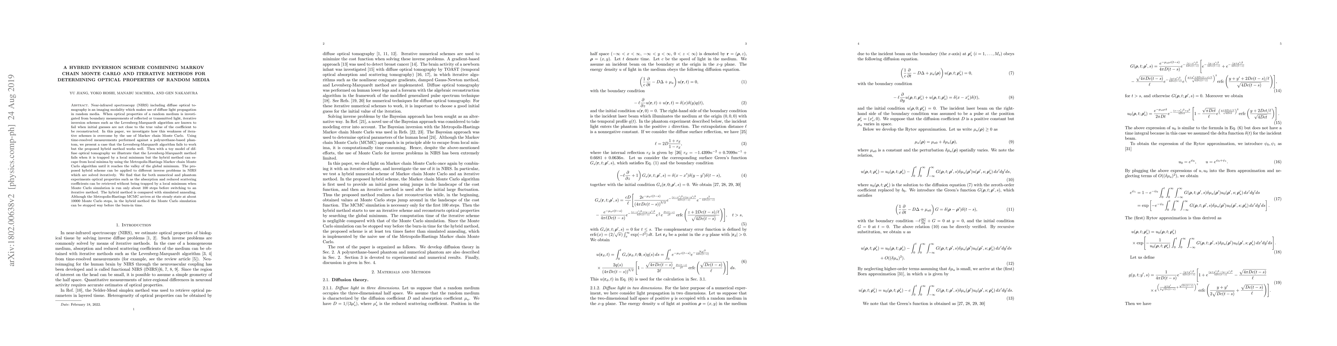 This paper proposes a hybrid inversion scheme combining Markov chain Monte Carlo (MCMC) and iterative methods to determine optical properties of random media using near-infrared spectroscopy. The hybrid method successfully escapes local minima, allowing accurate retrieval of absorption and scattering coefficients, outperforming the Levenberg-Marquardt algorithm in both numerical and phantom experiments.