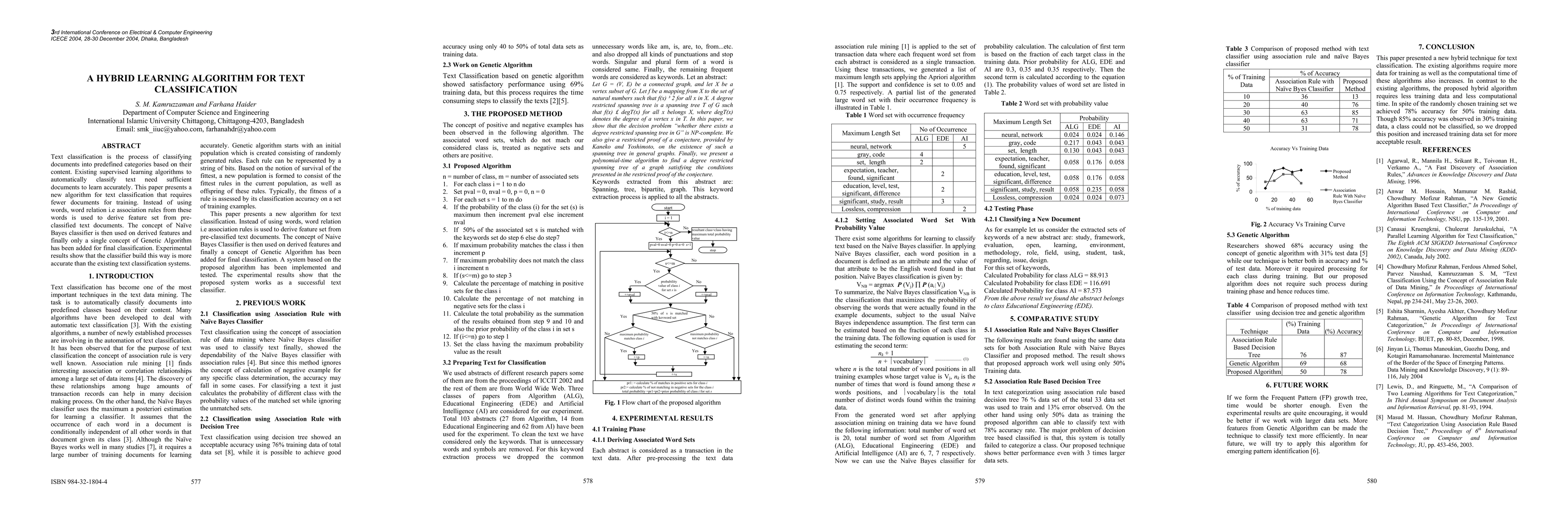 This paper introduces a hybrid learning algorithm for text classification that uses association rules to derive features from preclassified documents, applying a Naive Bayes classifier and a Genetic Algorithm for final classification, achieving higher accuracy with fewer training documents. Experimental results demonstrate its superiority over existing systems.