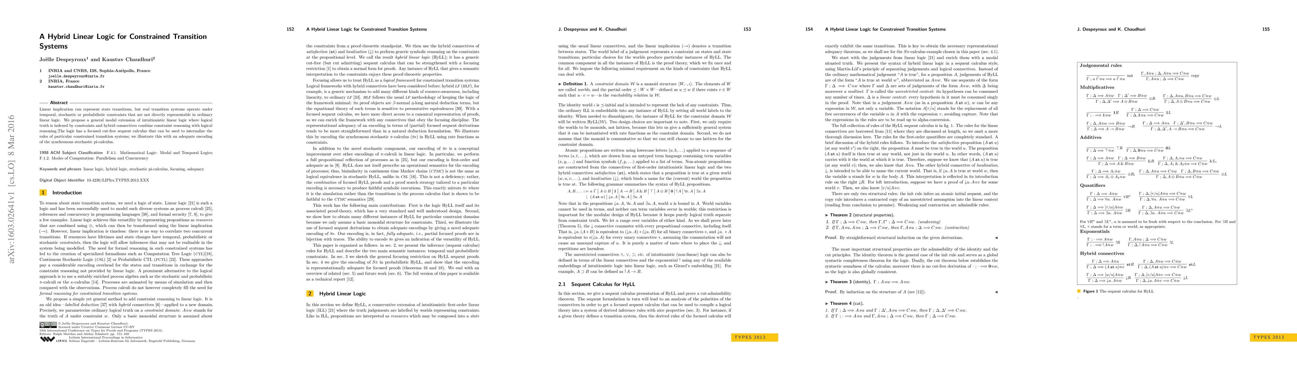 This paper proposes a hybrid linear logic extension to represent state transitions in constrained transition systems, integrating temporal, stochastic, and probabilistic constraints. It introduces a focused cut-free sequent calculus for internalizing rules of specific constrained systems, demonstrated through the encoding of the synchronous stochastic pi-calculus.