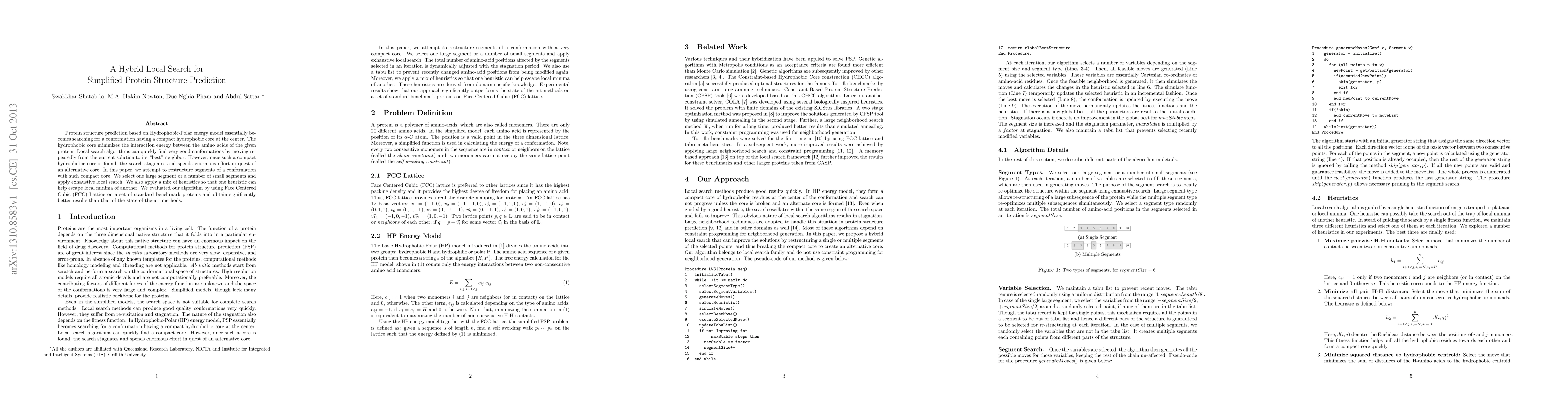 Protein structure prediction based on Hydrophobic-Polar energy model essentially becomes searching for a conformation having a compact hydrophobic core at the center. The hydrophobic core minimizes the interaction energy between the amino acids of the given protein. Local search algorithms can quickly find very good conformations by moving repeatedly from the current solution to its "best" neighbor. However, once such a compact hydrophobic core is found, the search stagnates and spends enormous effort in quest of an alternative core. In this paper, we attempt to restructure segments of a conformation with such compact core. We select one large segment or a number of small segments and apply exhaustive local search. We also apply a mix of heuristics so that one heuristic can help escape local minima of another. We evaluated our algorithm by using Face Centered Cubic (FCC) Lattice on a set of standard benchmark proteins and obtain significantly better results than that of the state-of-the-art methods.